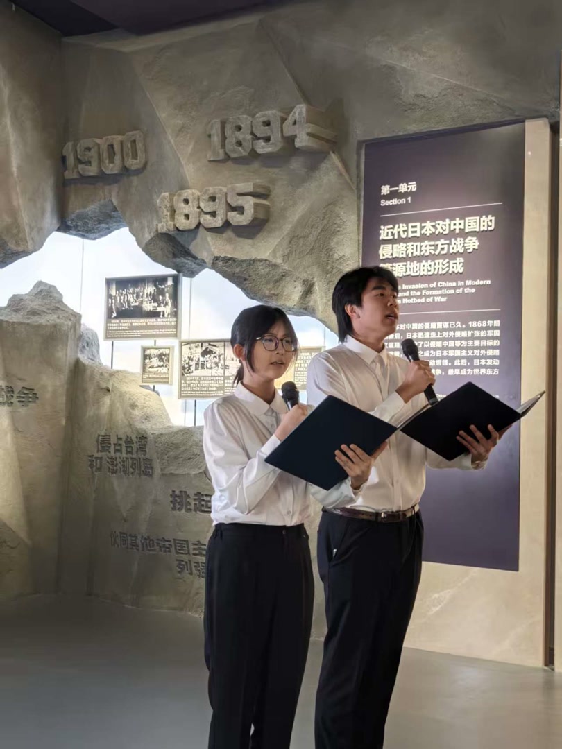 “痛哭沦亡祸,同胞仗义争。执戈齐敌忾,报国有书生……”抗战馆展厅内,首都师范大学文学院学生带来《抗战时期台湾诗歌集》节选朗诵,吸引观众驻足。他们身后的裂痕墙,无声诉说着近代日本对包括台湾在内的中国领土的侵略。学生宋伯涵说,在展厅里朗诵,让他对诗歌所表达的内容和情感有了更加深刻的理解。