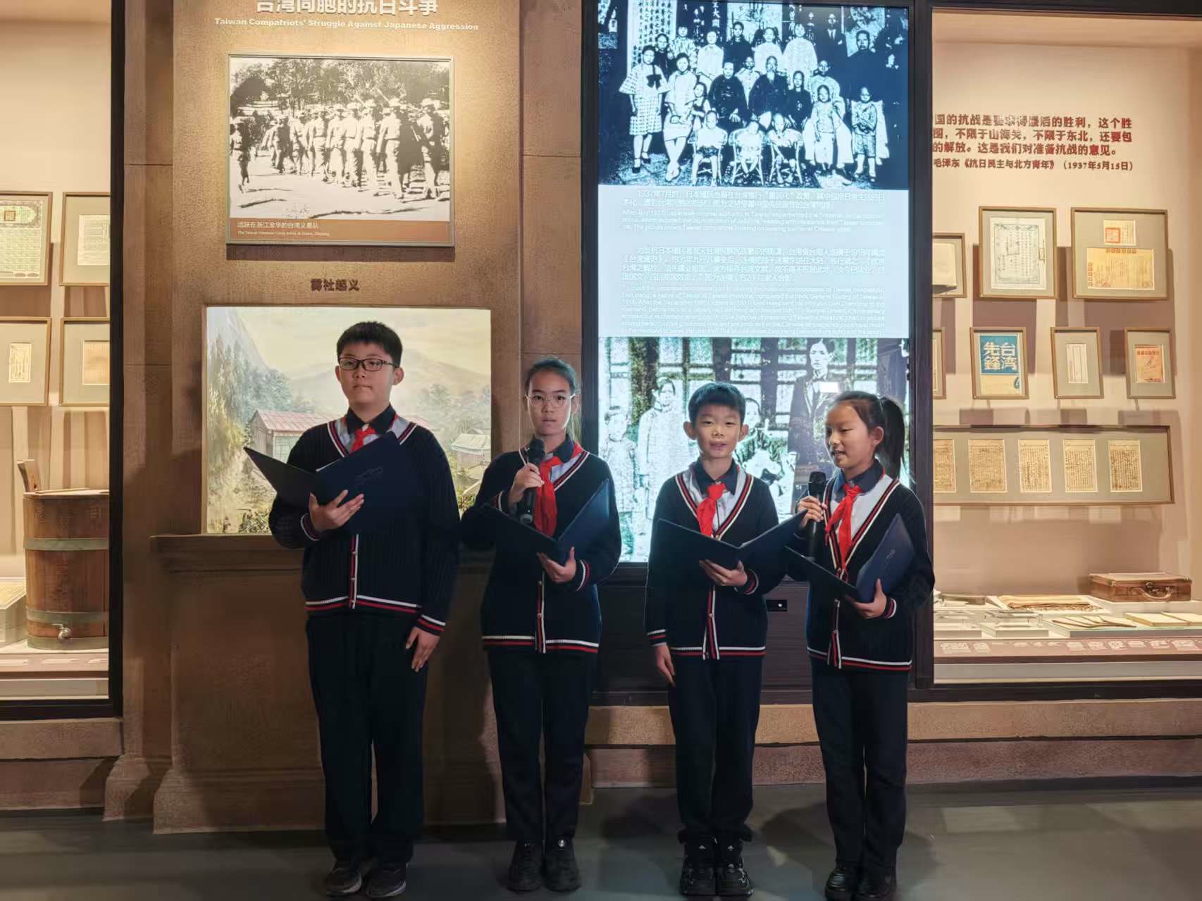 全民族抗战爆发后,许多台湾同胞冲破重重阻力,回到祖国大陆直接参加抗日斗争,其中就包括1939年2月在浙江金华成立的台湾义勇队。站在台湾义勇队的历史照片前,北京第十二中学附属实验小学学生朗诵起《台湾义勇队少年团团歌》,声音稚嫩却有力:“在压迫下斗争,在斗争中学习,在学习中成长……要收回我们的家乡,我们得和敌人拼个生死存亡!”