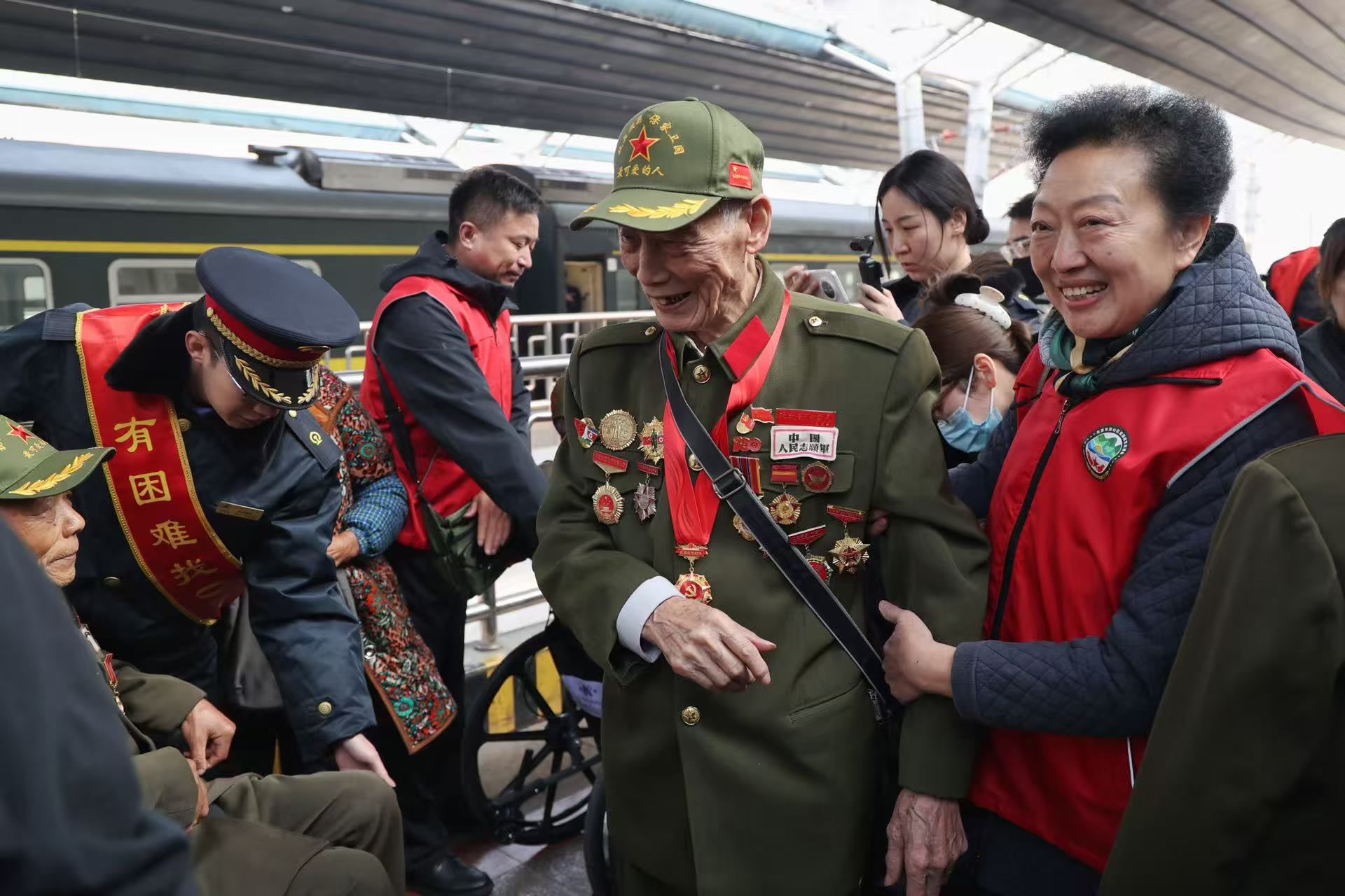 “雄赳赳,气昂昂,跨过鸭绿江……”95岁的抗美援朝老兵陈莺荞胸前挂满了勋章,刚下车,便和大家一起唱起了《中国人民志愿军战歌》,歌声虽不洪亮,却字字铿锵。“来到北京特别高兴,感受到了大家对我们的关心。我想看看天安门广场,去瞻仰毛主席……”老人的话语道出了众多老兵的心声。