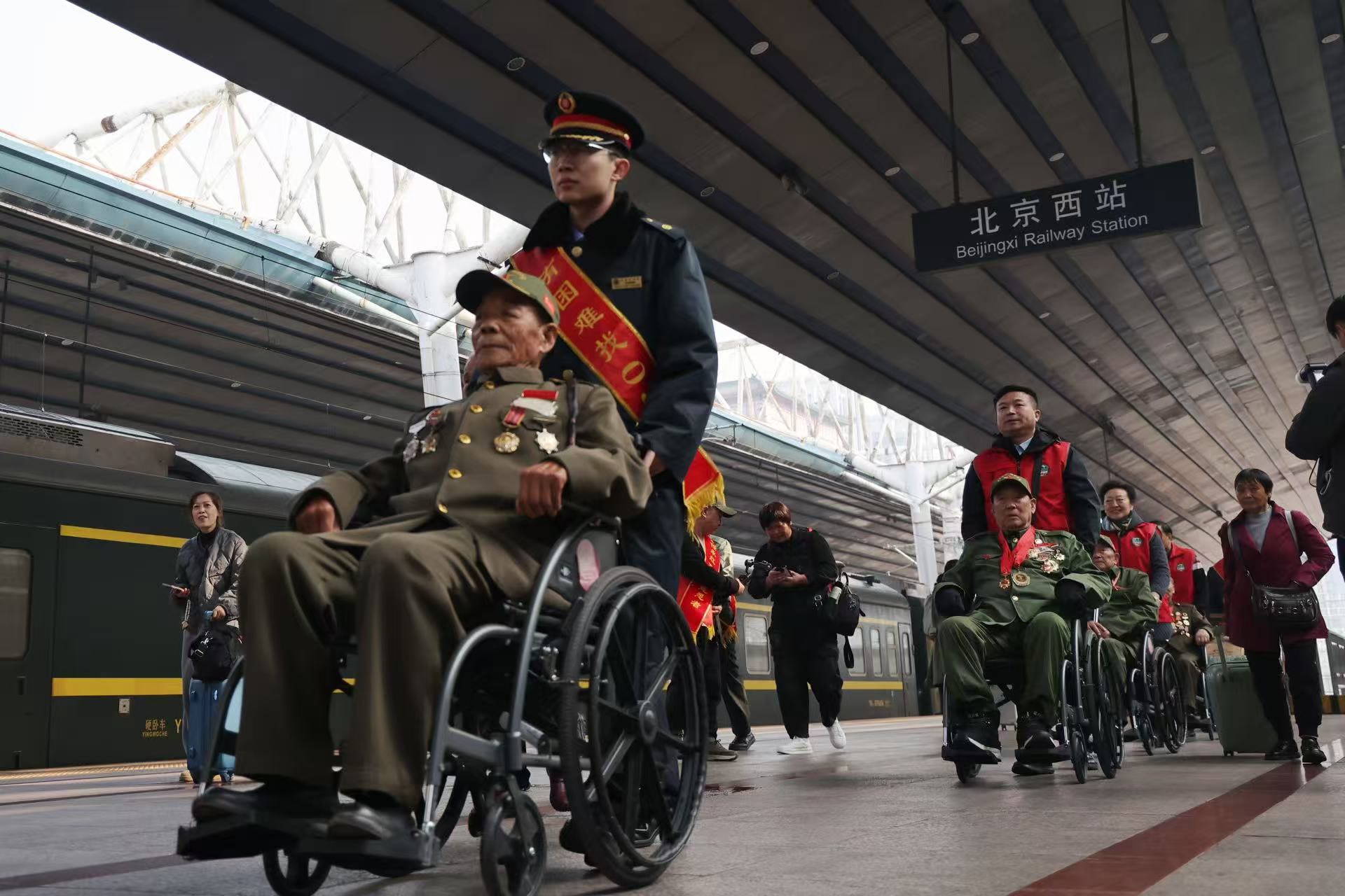上午10时许,D4次列车缓缓驶入北京西站。数十名志愿者早已等候在站台上。车站特意开辟了绿色通道,等待着英雄的到来。列车车门打开,9名来自重庆的老兵身着笔挺的军装,缓缓走出车厢;志愿者们立刻上前搀扶,推起轮椅,用细致的服务迎接老前辈的到来。