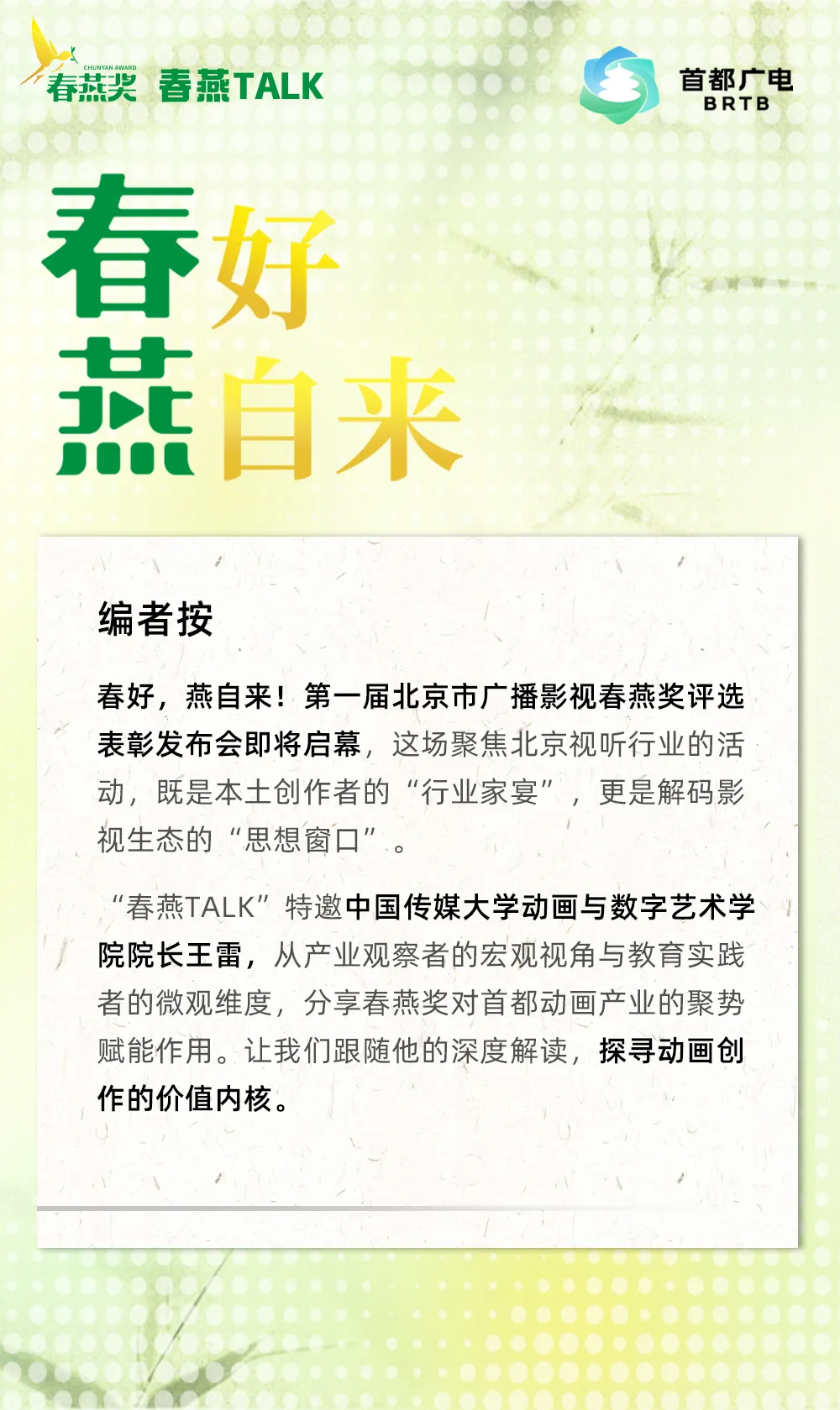 王雷表示,通过“春燕奖”对动画作品的评选,折射出北京对动画产业的前瞻布局——以专业评价引导创作风向,以奖项赋能构建人才生态,最终助力北京成为全国动画人的“必选之地”。后续必将涌现更多扎根首都、映照时代的动画精品,为北京建设全国文化中心、推动文化强国建设注入更强劲的“动画力量”。