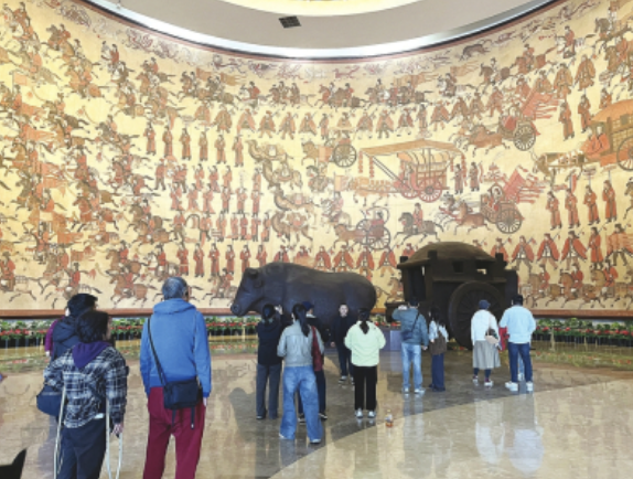 壁画前方,铁铸雕塑《牛拉鳖甲车》造型豪迈。“乘坐牛车是当时贵族身份地位的象征……”导游的音调抑扬顿挫,观众听得津津有味。