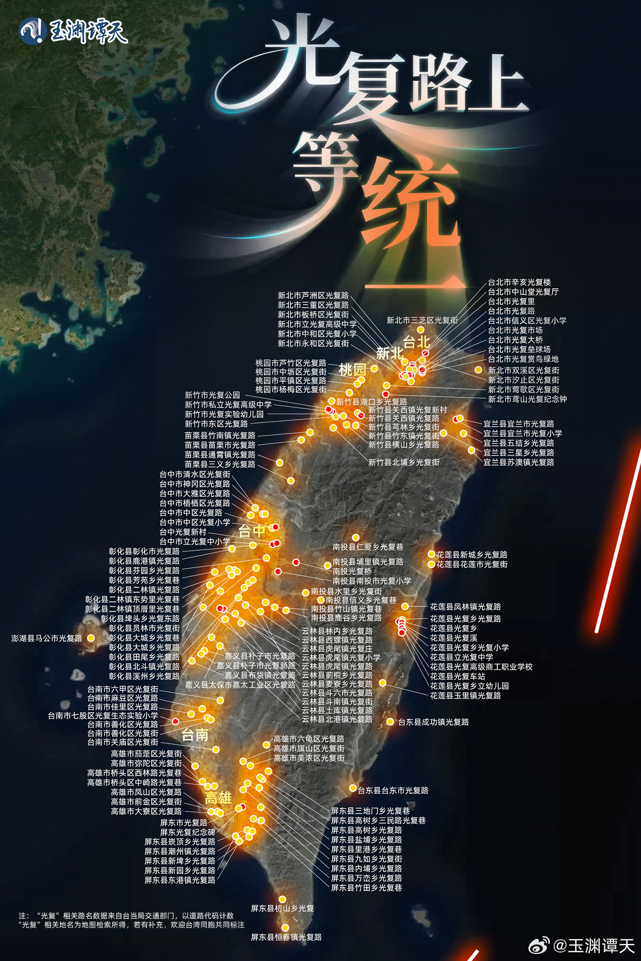 其中,谭主统计发现,当前在台湾以“光复”为名的路就有151条,以“光复”为名的建筑、机构等更是不计其数。