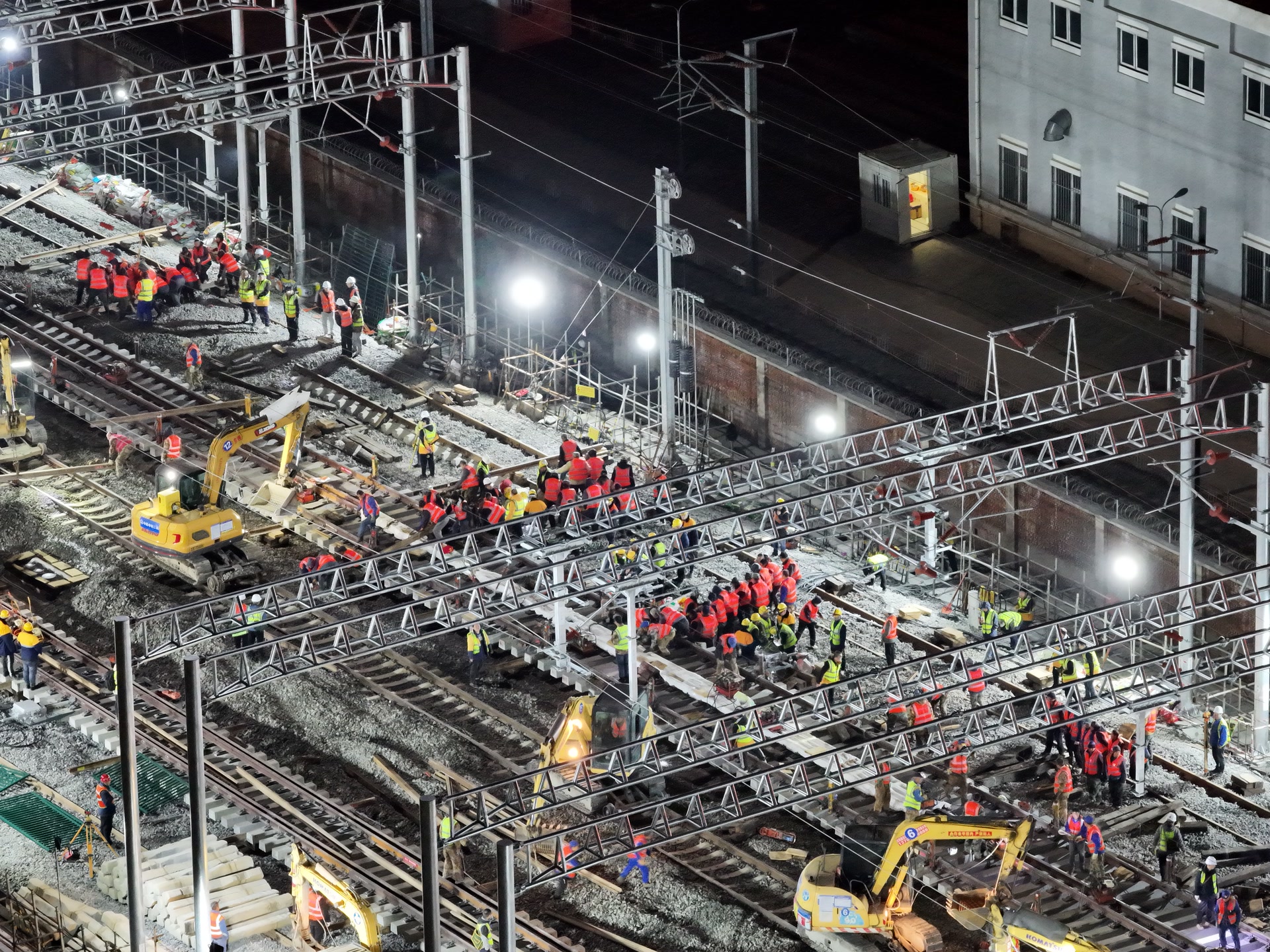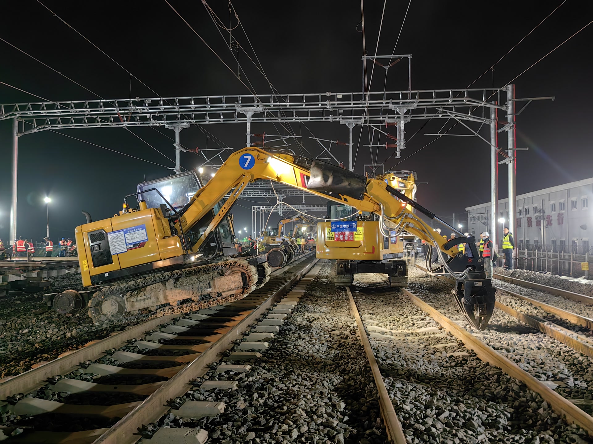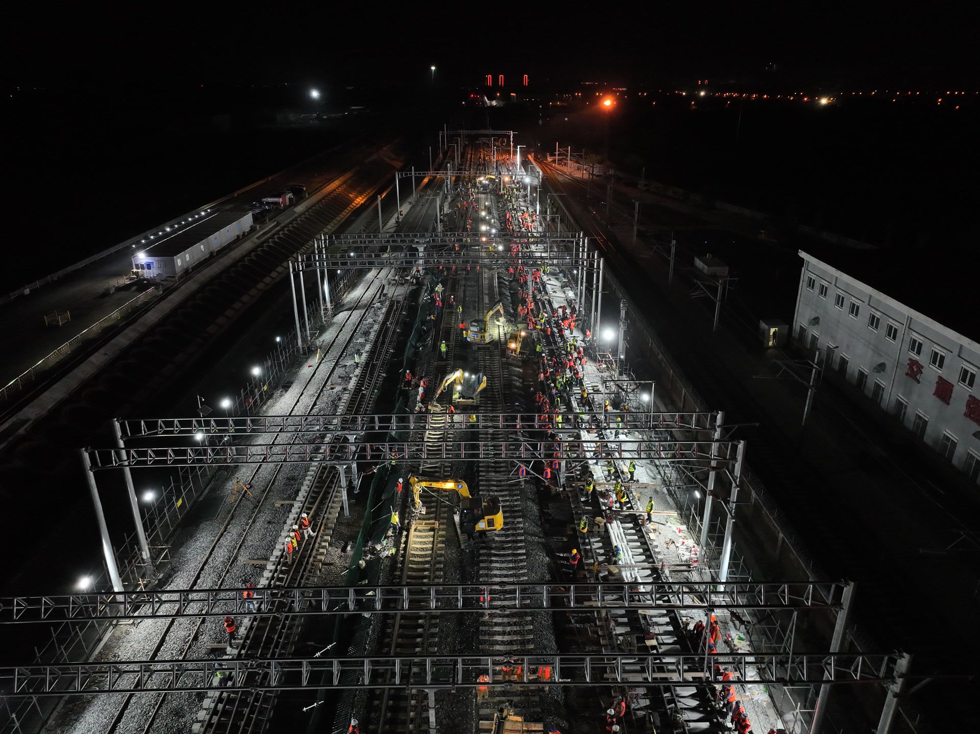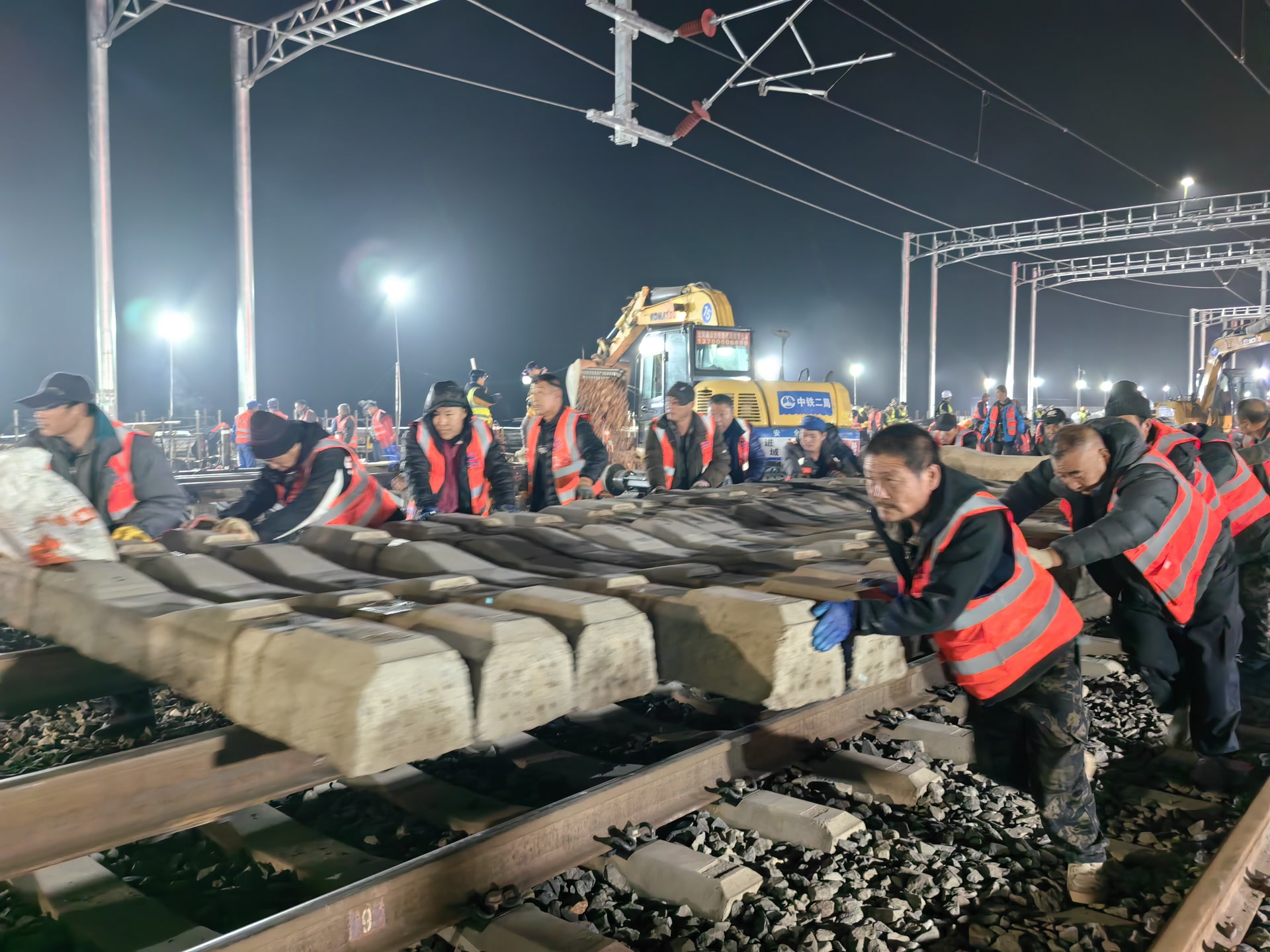 据中铁二局项目副指挥长陈建南介绍,此次42号道岔插铺施工采用了场外拼装焊接和远距离纵移到预定位置的方案,有效解决了场地狭窄受限和工期紧张带来的不利影响,确保了施工如期完成。同时,道岔横移定位采用了液压动力精准同步横移系统,实现了42号道岔高精度高质量、零误差安装就位。