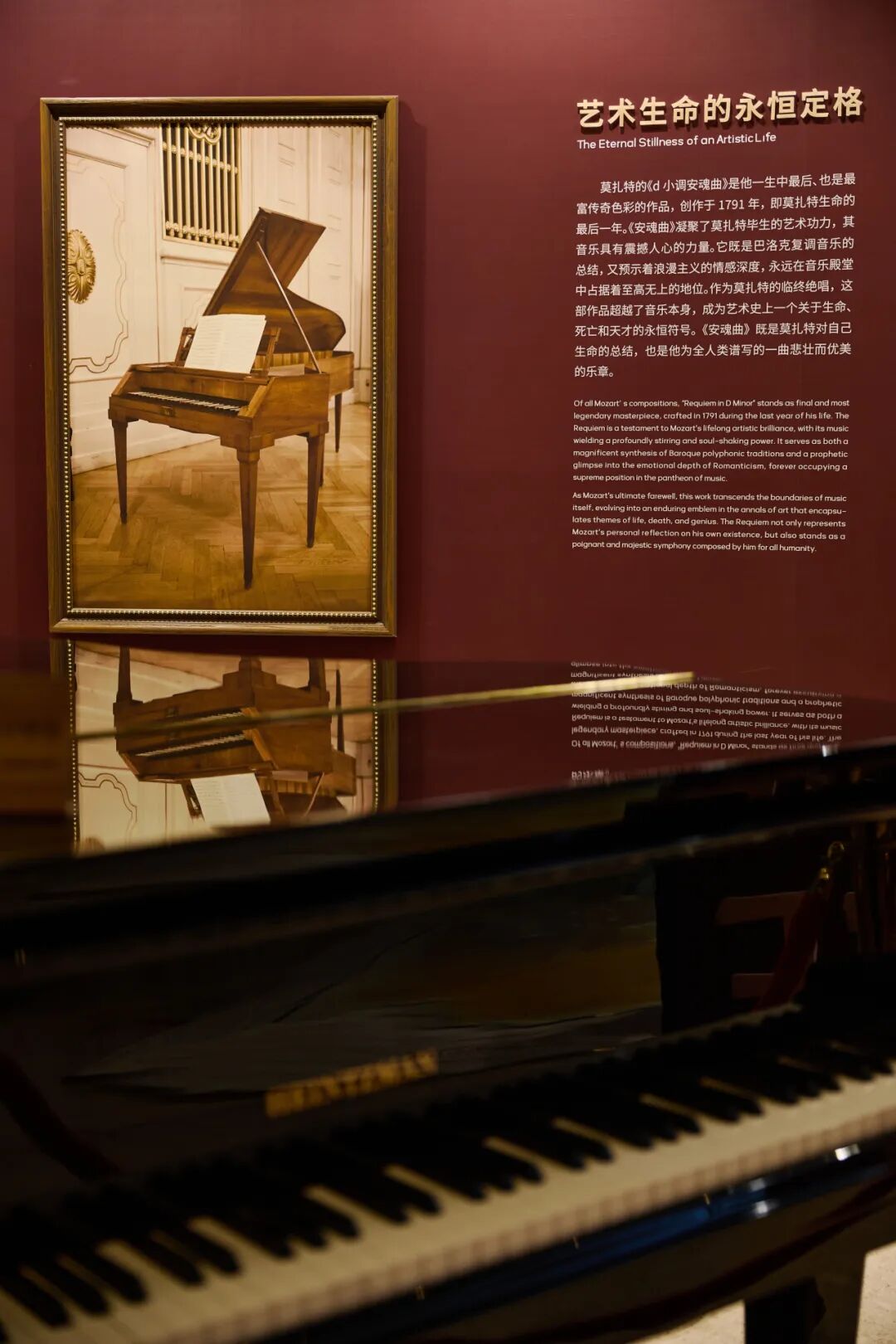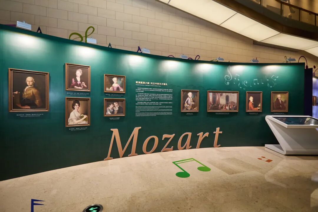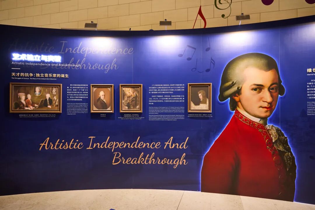 展墙正面以莫扎特生平为“时间经线”,通过莫扎特人物画像、复刻曲谱与手稿,以及记录其人生节点的大事记年表,系统呈现了莫扎特的成长轨迹。