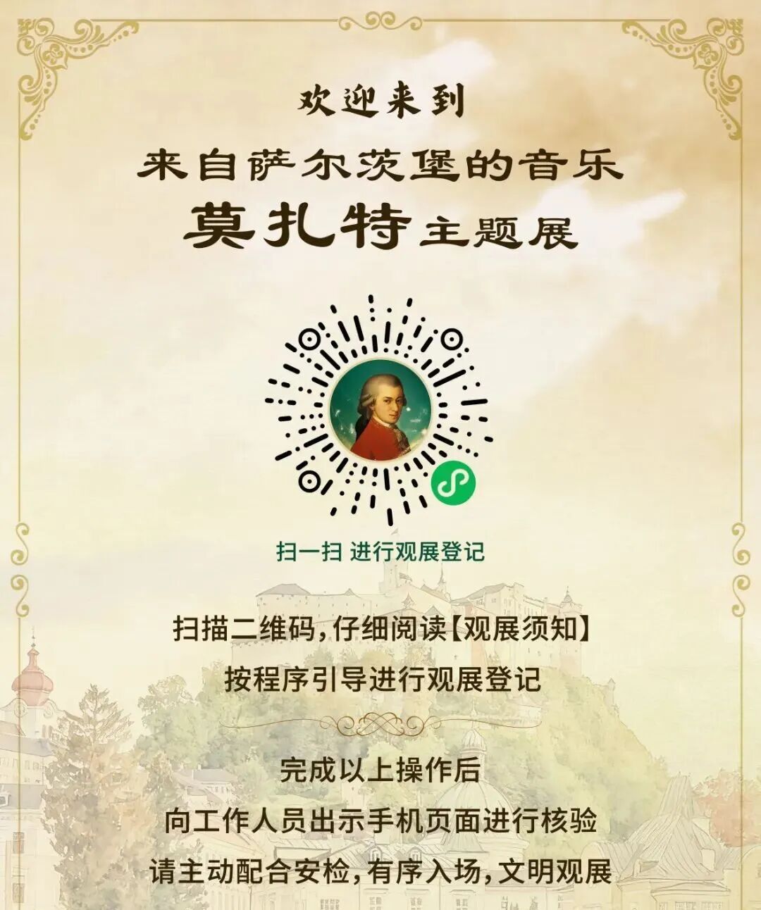 本次莫扎特主题展作为“西城·萨尔茨堡音乐周”重要活动之一,在北京西城天桥拉开了音乐周的序幕。 展览得到了莫扎特基金会的大力支持, 授权莫扎特珍贵手稿复制品展出,促成全面覆盖莫扎特生平的专业主题展览首次在国内举办。