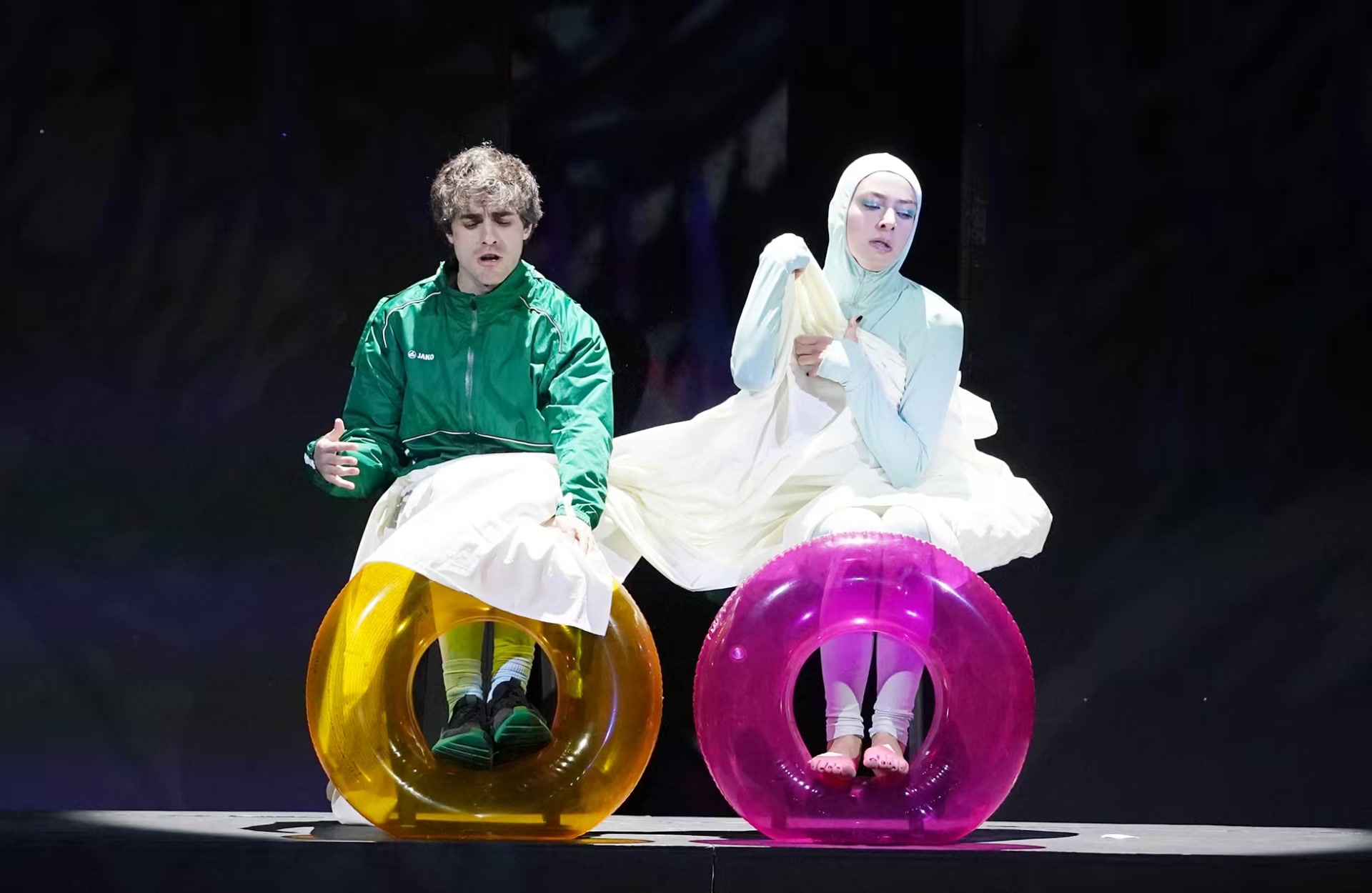 这版《仲夏夜之梦》的先锋性,在于将一部“神仙喜剧”重塑为一部关于人类欲望的寓言。他通过冰冷的舞台、充满张力的肢体和碎片化的叙事,强迫观众离开安全的观赏区,去直面爱情中的疯狂、荒诞与痛苦。导演大胆地打破了原著的线性叙事,场景之间的切换生硬而突然,如同梦境中毫无逻辑的跳转。一段突如其来的RAP、新闻发布会,甚至将“四角”恋人的冲突直接演变为一场拳击擂台赛……因为语言障碍观众需要分神看字幕,而台上演员的肢体表演又实在精彩,他们用超强的身体控制能力表达富于戏剧张力的内心情感,动作和台词一样不可忽视一秒,否则就会影响对剧情的理解。而舞台之外,还经常会从剧场的哪个角落突然走出人来。总之,如果观众对莎翁的戏剧文本不是烂熟于心,会被这种神一段、鬼一段的编排看得精疲力竭。