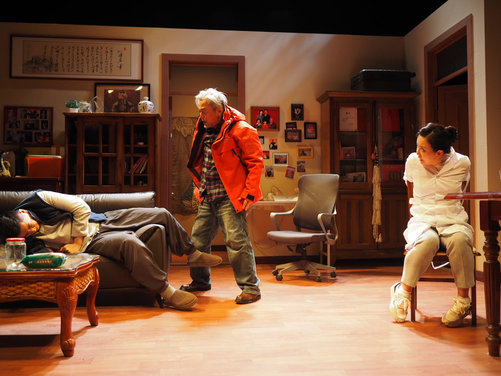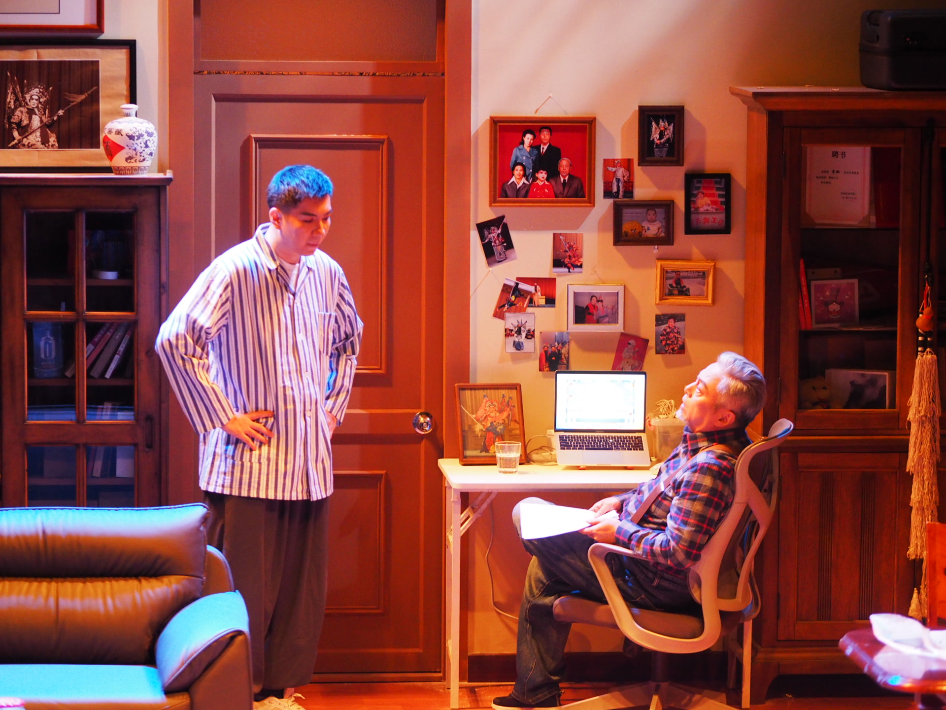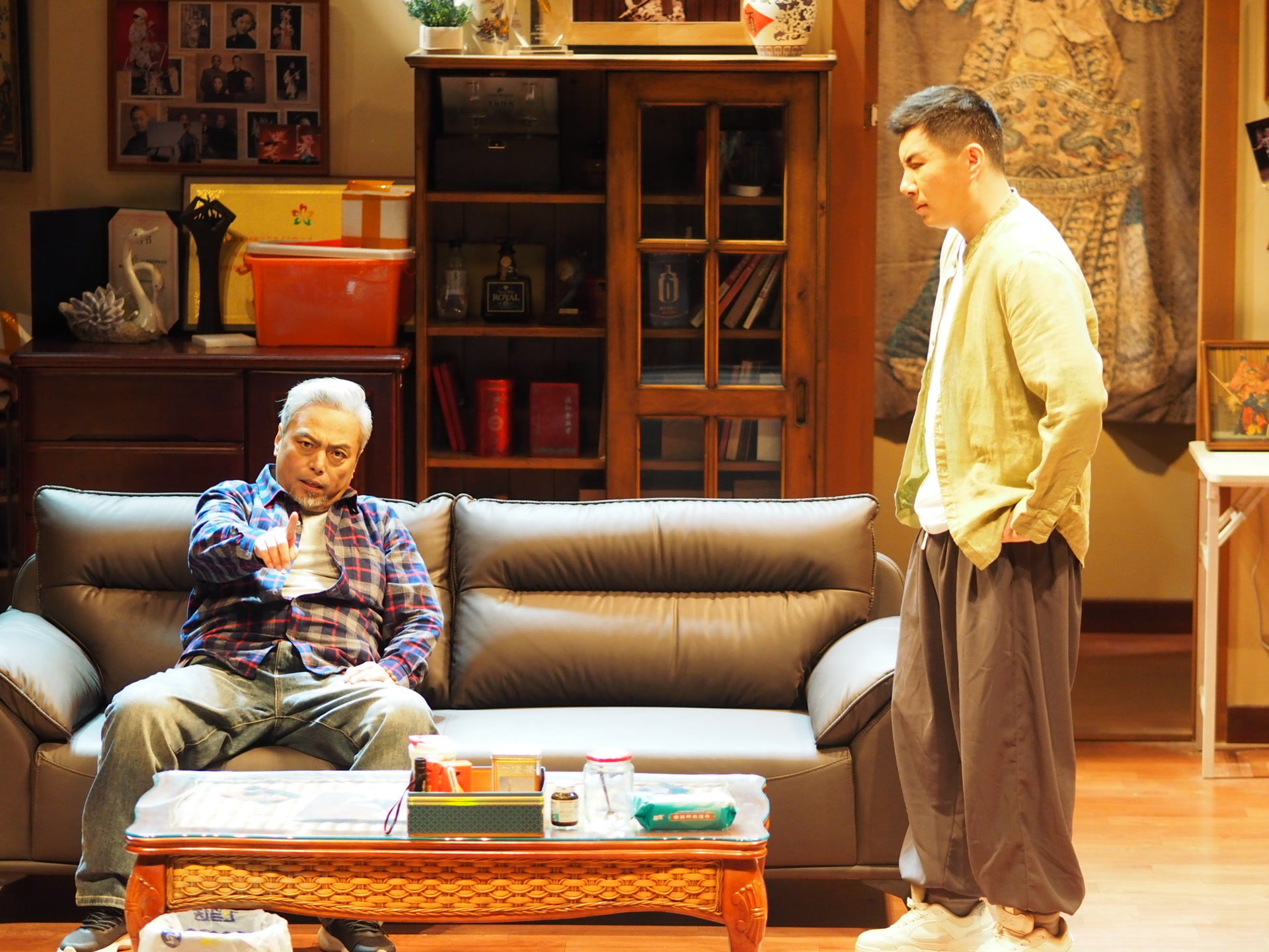 整个演出宛如缓缓展开的生活长卷,在这间充满生活和岁月痕迹的老屋客厅中徐徐铺陈。老旧的实木家具与现代电脑桌冷硬对峙,泛黄的京剧剧照与生活杂物烟火交织,恰如唐宏鸣与唐驰这对父子的人生:一个把生命献给京剧戏魂,一个在逃离与回望中撕扯半生。