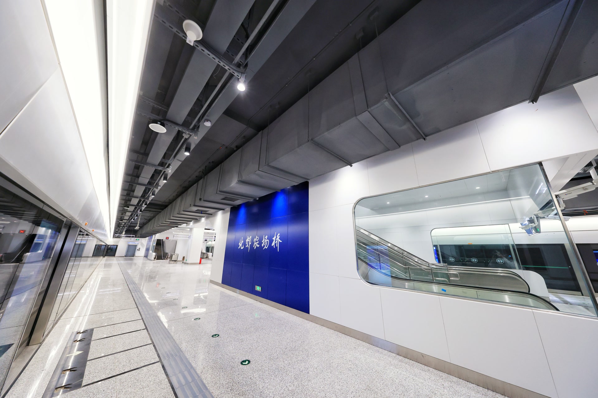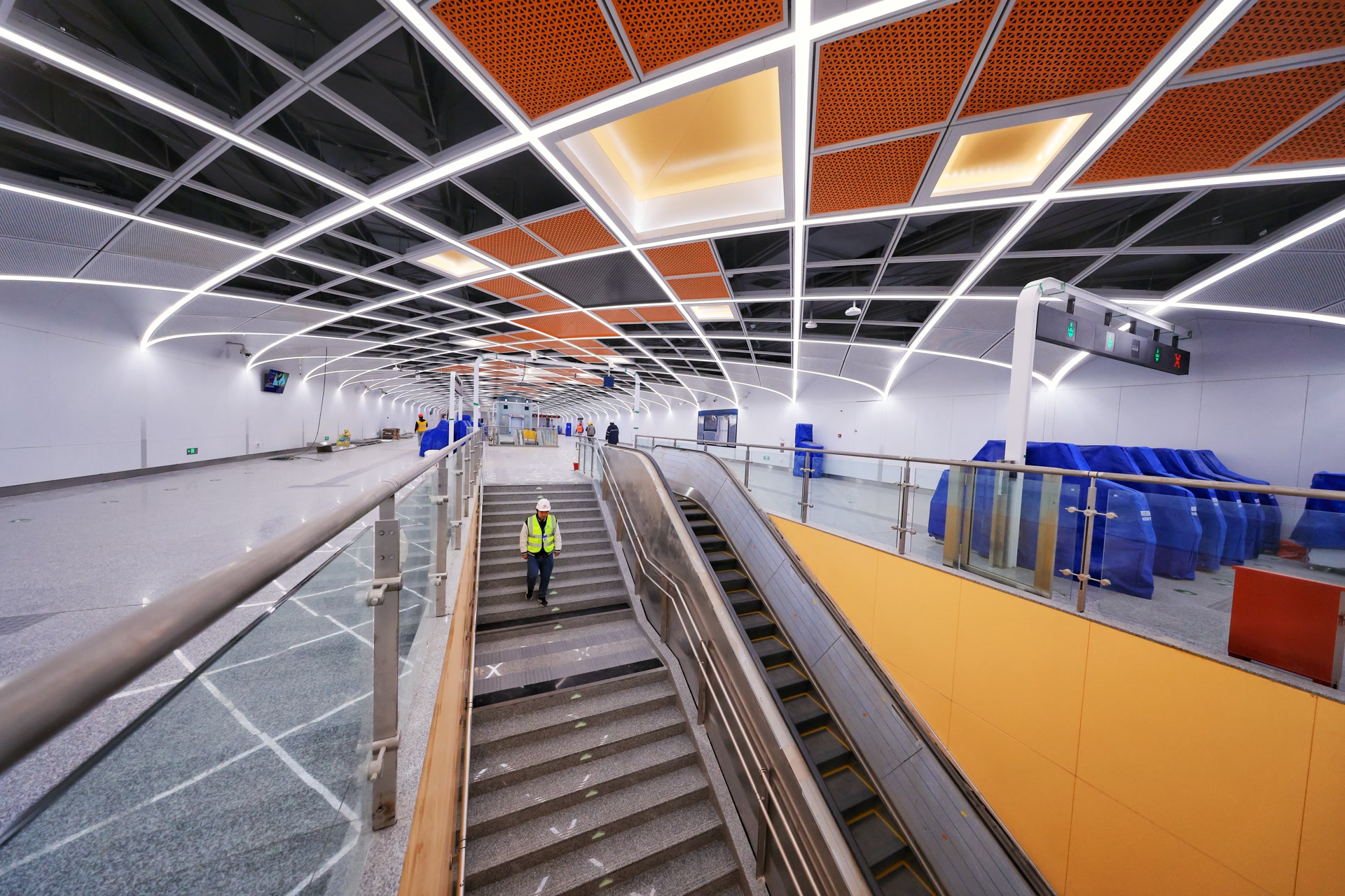 记者了解到,为了节约成本、节约工期,该线路车站装修采用素面混凝土技术,车站建筑中结构、设备设施与车站功能有机整合,有效释放了原有站体空间。