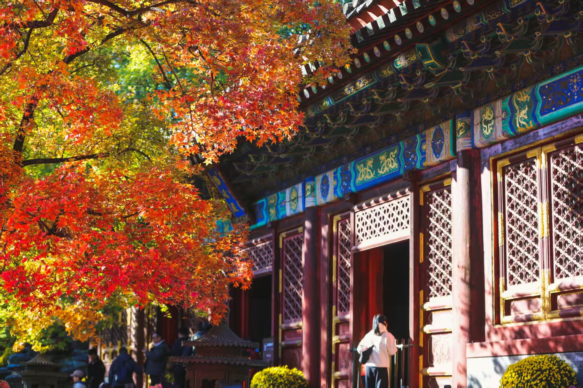 勤政殿:作为公园的标志性建筑、静宜园二十八景之首,勤政殿殿前栽植“消息树”元宝枫已进入变色中期。橙红的叶片与皇家殿宇彩画、香炉、窗棂相映成趣,尽显古韵秋华,是拍摄建筑与红叶完美结合的经典机位。