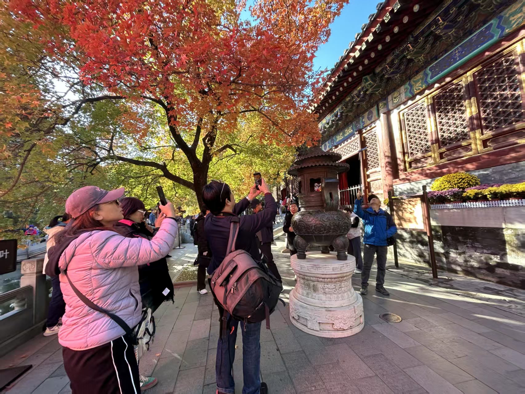 霜降节气已过,京城秋意渐浓。随着昼夜温差显著加大,香山公园内的彩叶变色率近日迅速提升,目前已呈现出红、橙、黄、绿交织的绚丽景象,正式宣告进入一年中最富诗意的金秋最佳观赏期。