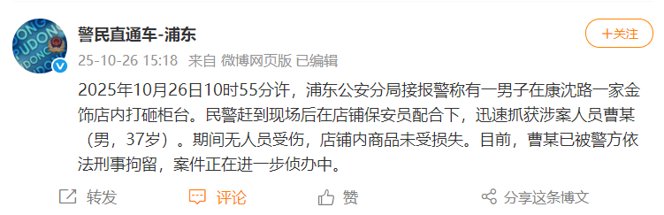 2025年10月26日10时55分许,浦东公安分局接报警称有一男子在康沈路一家金饰店内打砸柜台。民警赶到现场后在店铺保安员配合下,迅速抓获涉案人员曹某(男,37岁)。期间无人员受伤,店铺内商品未受损失。目前,曹某已被警方依法刑事拘留,案件正在进一步侦办中。