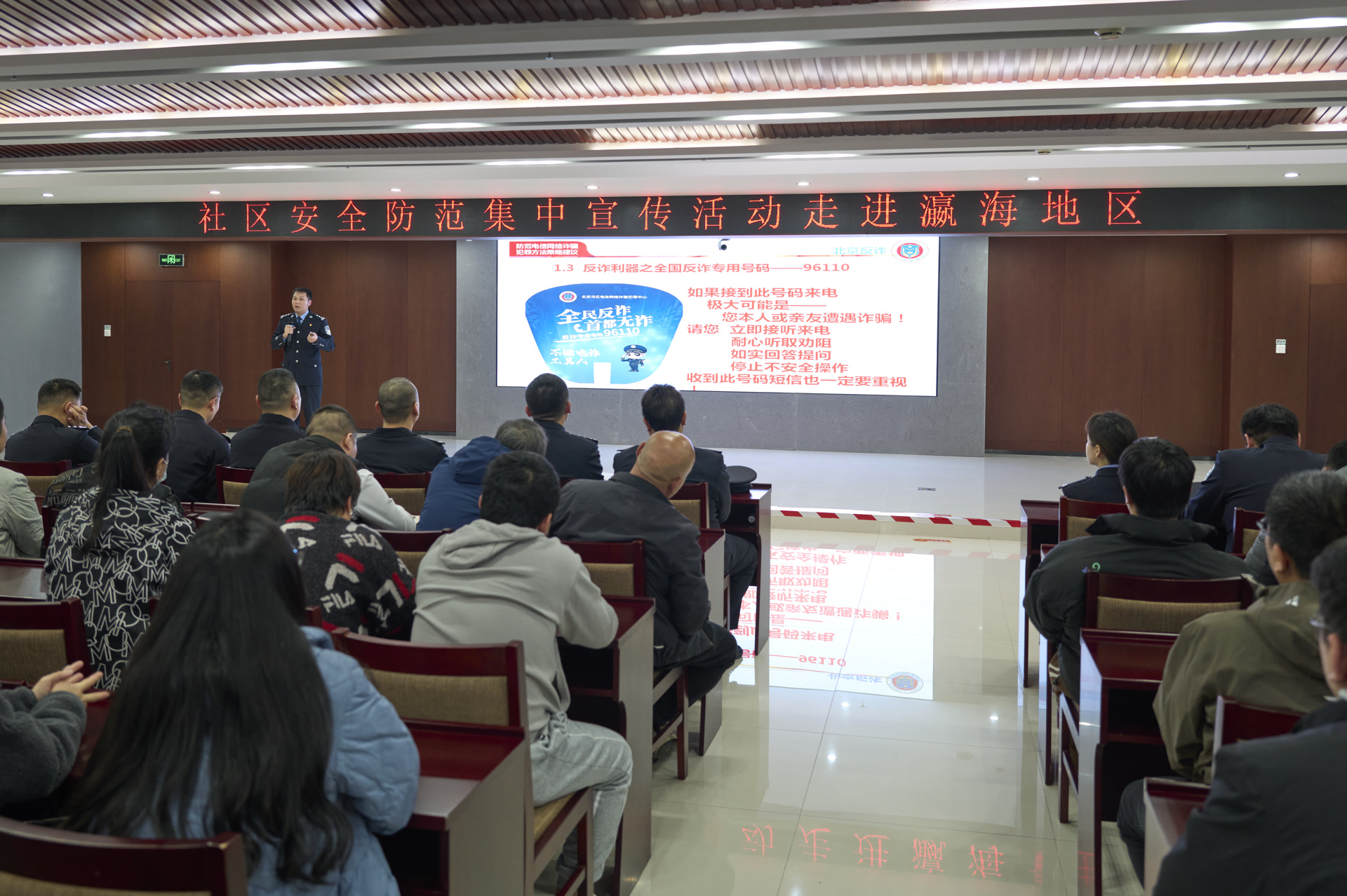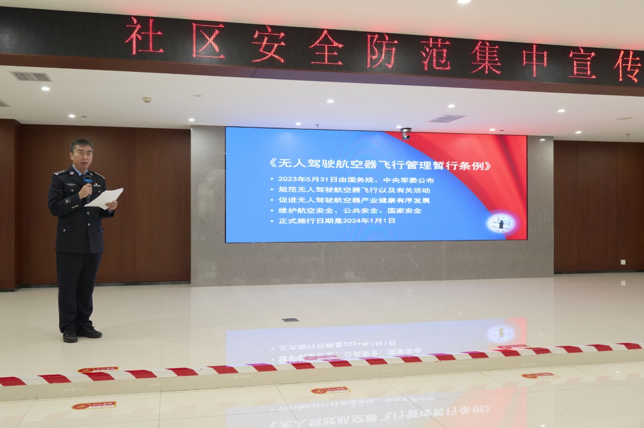 其中,人口基层总队民警围绕防范入室盗窃进行安全宣讲;刑侦总队民警以案说法、以案释法,围绕近期新发多发的电信网络诈骗犯罪手段及防范技巧进行宣讲;治安总队民警结合大兴区区位特点,就《北京市人民政府关于公布无人驾驶航空器管制空域范围的通告》和《北京市民用机场净空保护区域管理若干规定》等政策法规开展普法提示,并介绍了防范非机动车盗窃技巧;大兴分局瀛海派出所通报了辖区治安形势,并围绕出租房屋安全管理等进行提示。
