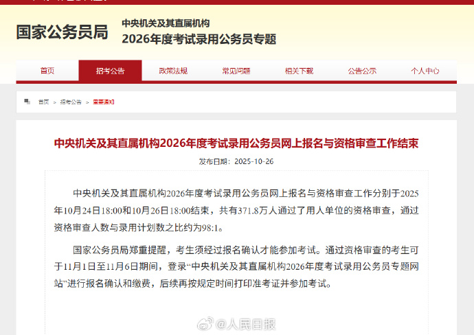 中央机关及其直属机构2026年度考试录用公务员网上报名与资格审查工作分别于2025年10月24日18:00和10月26日18:00结束,共有371.8万人通过了用人单位的资格审查,通过资格审查人数与录用计划数之比约为98:1。