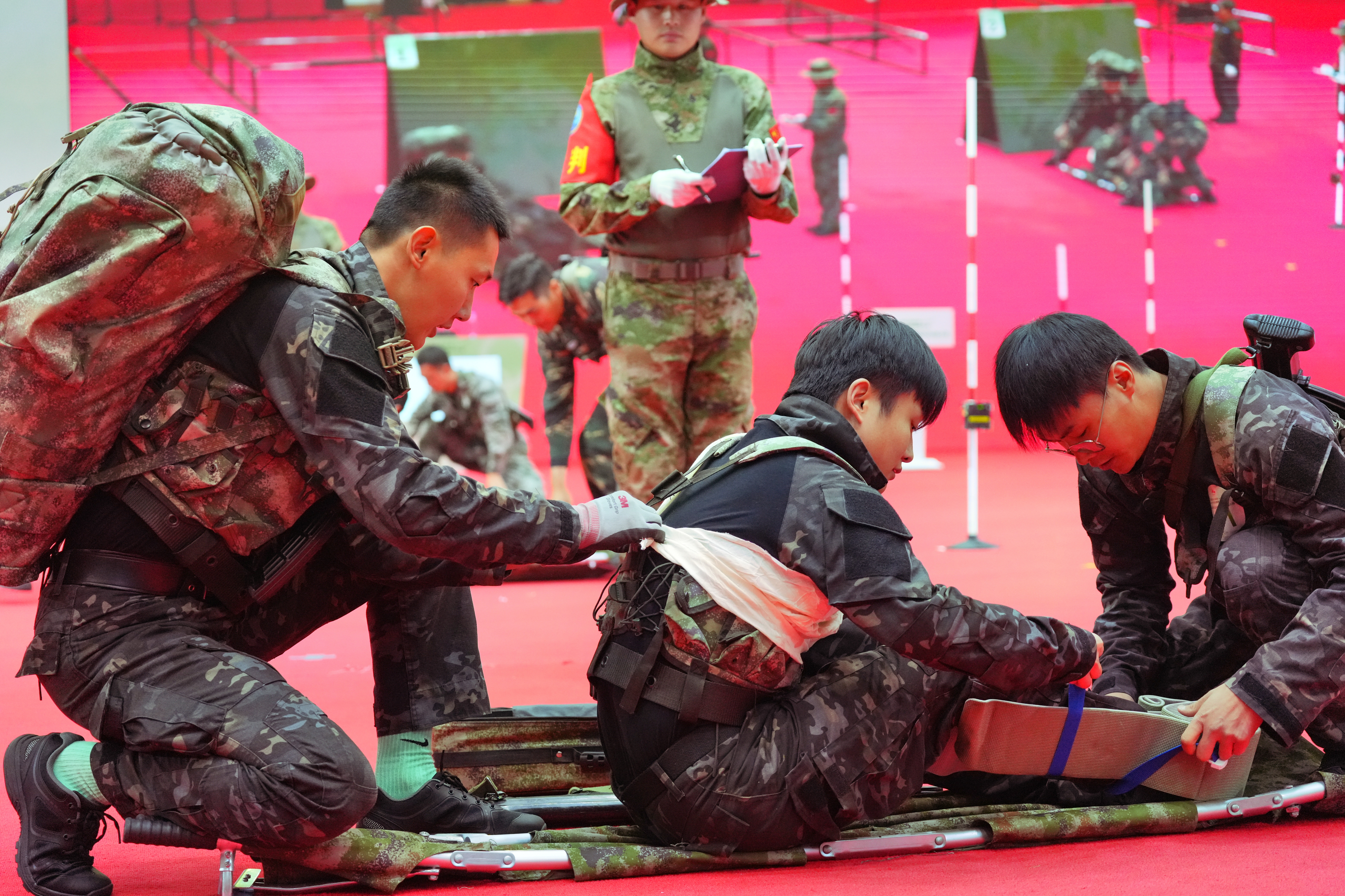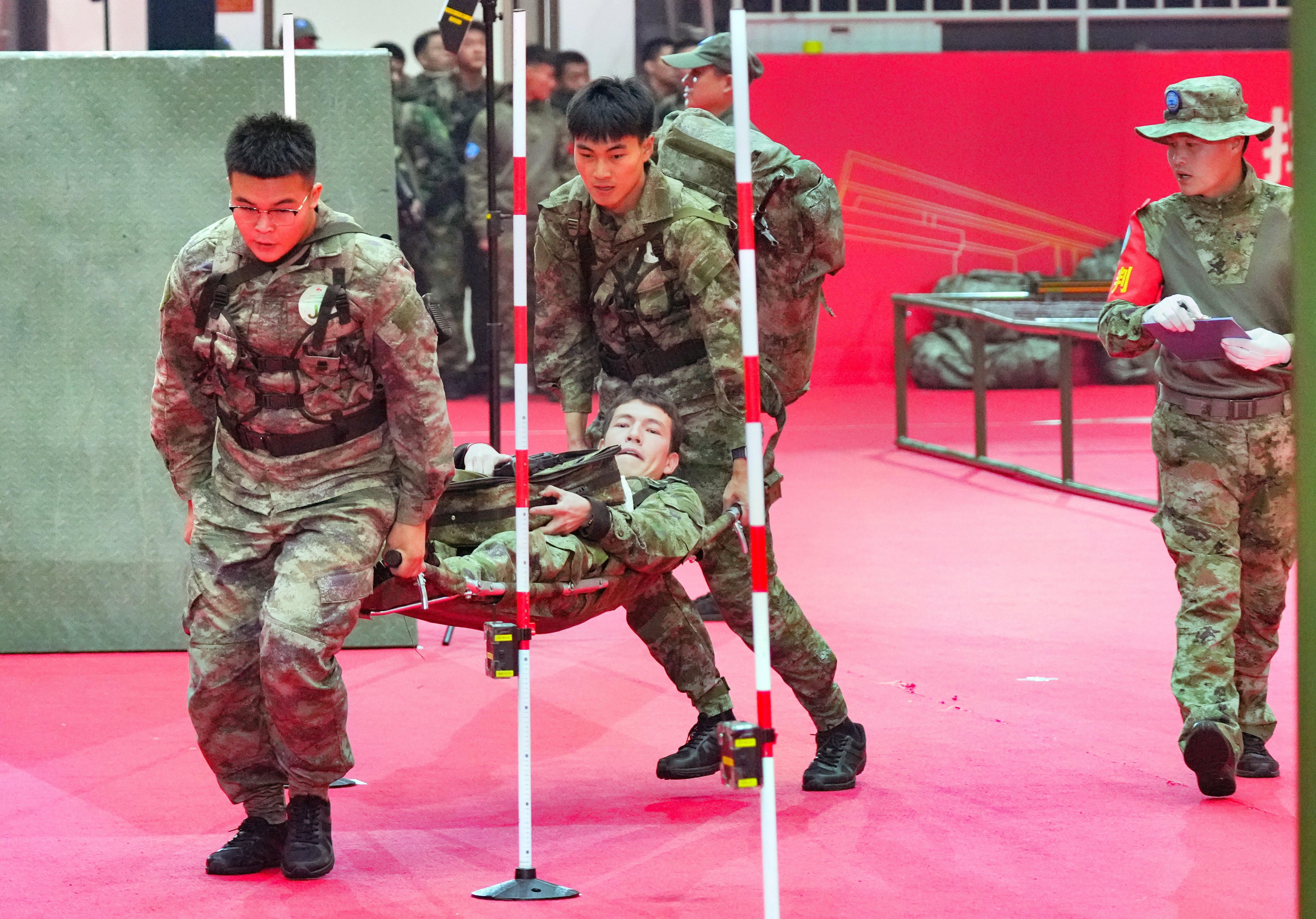 决赛分为技能竞赛和知识竞赛两大部分,既考验选手的技战术水平,又考验选手的知识储备和临场反应。其中,技能竞赛设置侧身匍匐通过战术网、翻越坡度墙障碍、战场救护、横渡云梯、手枪激光模拟射击等5项内容,既比速度,又比精度。为纪念中国人民抗日战争暨世界反法西斯战争胜利80周年,知识竞赛题目还特别突出了今年九三阅兵的元素。