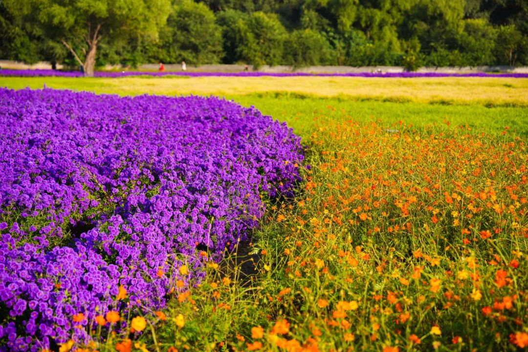 黄绿草坪为底,橘色黄秋英点缀