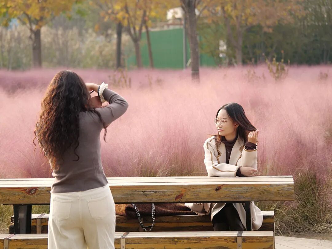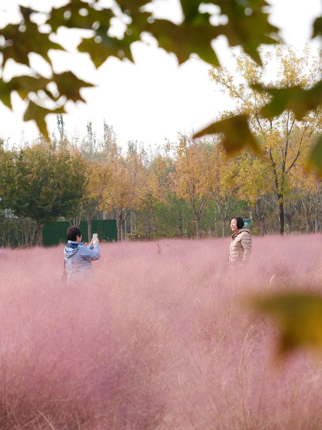 粉黛乱子草如烟似雾,与银杏的黄、枫叶的红相互点缀。
