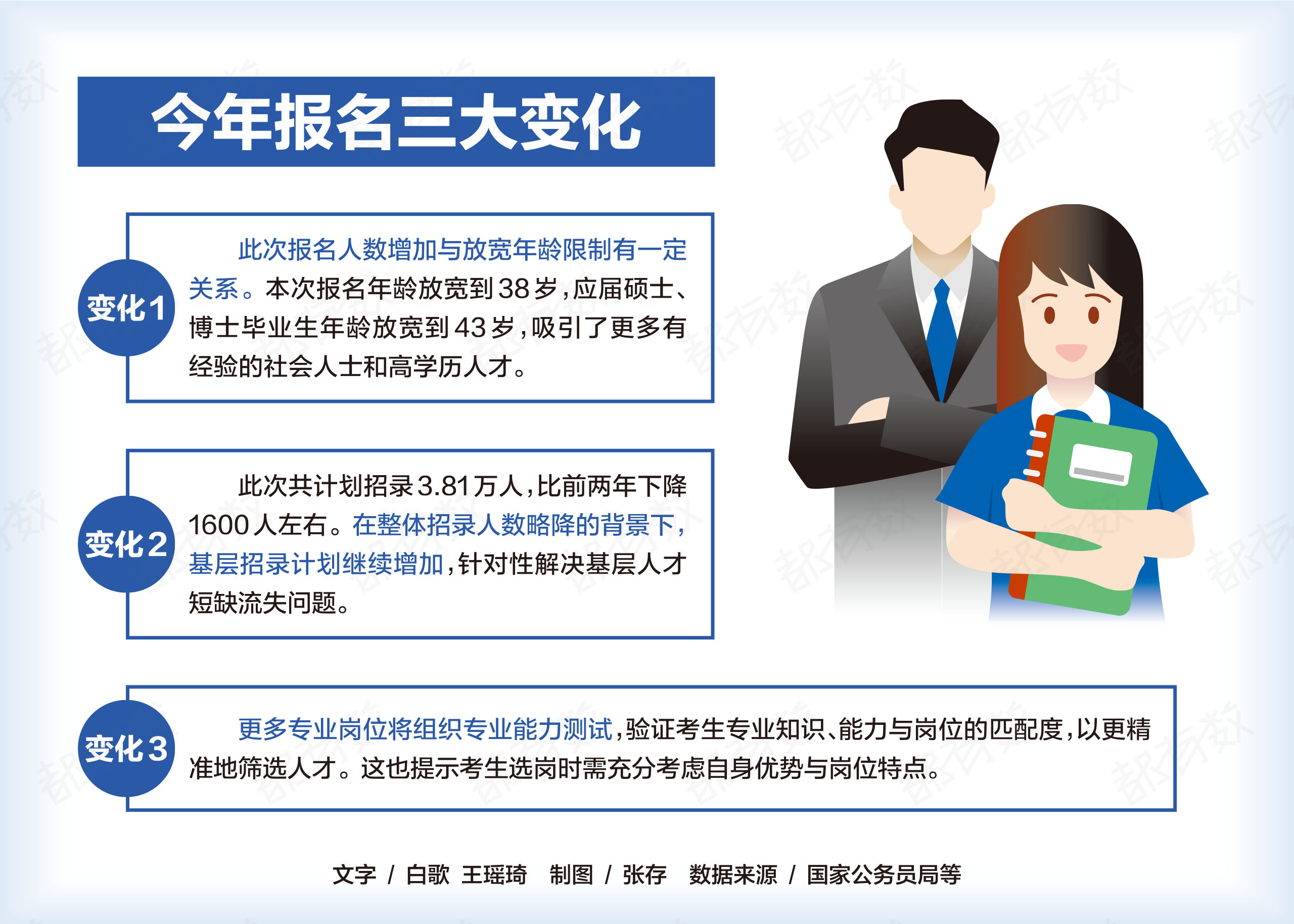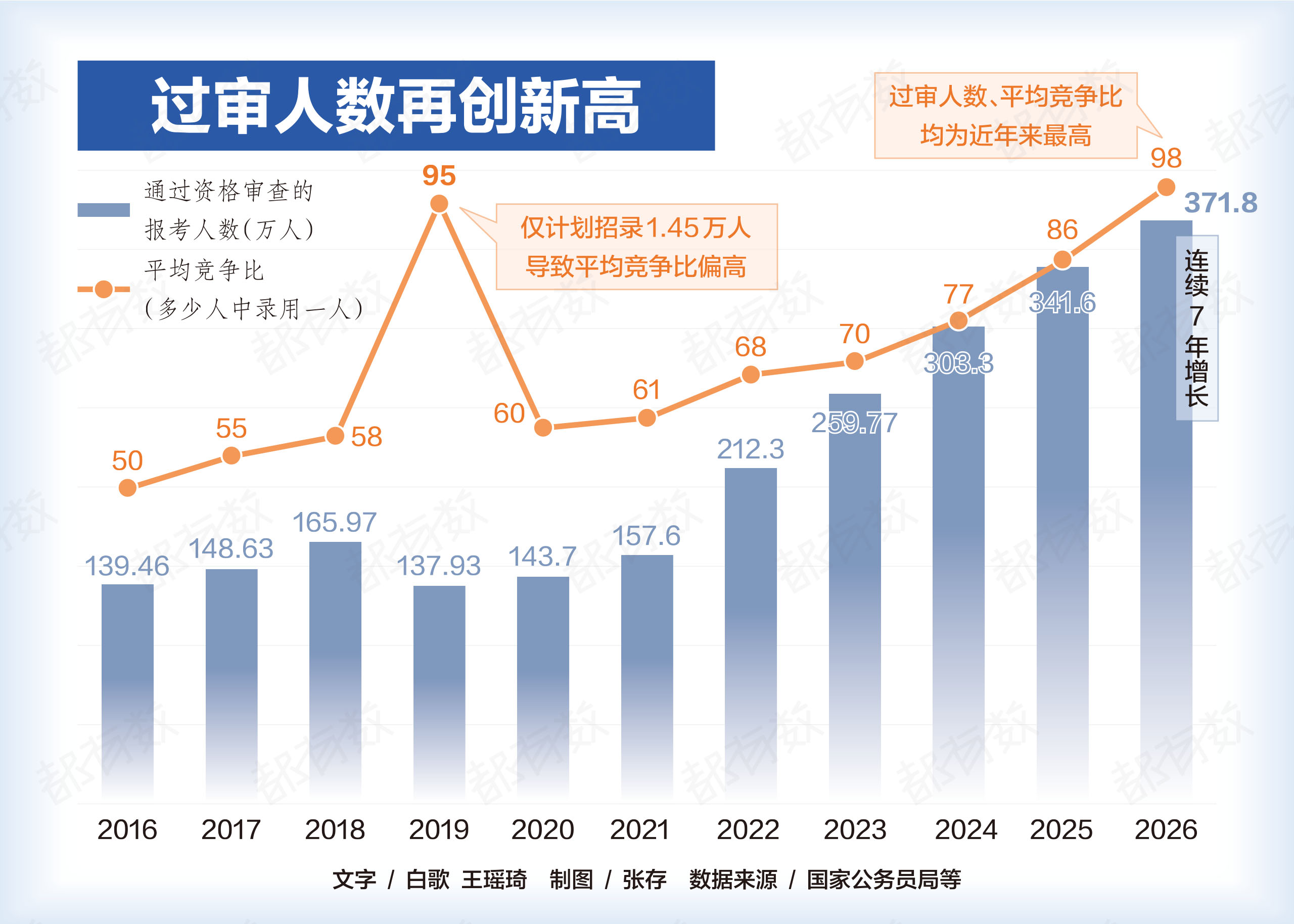 2026年度国考报名资格审查工作于昨晚6时结束,共有371.8万人通过了用人单位的资格审查,这一破纪录的数字再度反映出求职者对公职岗位的超高热情。报考数据还呈现出哪些趋势?我们为您一一解读。