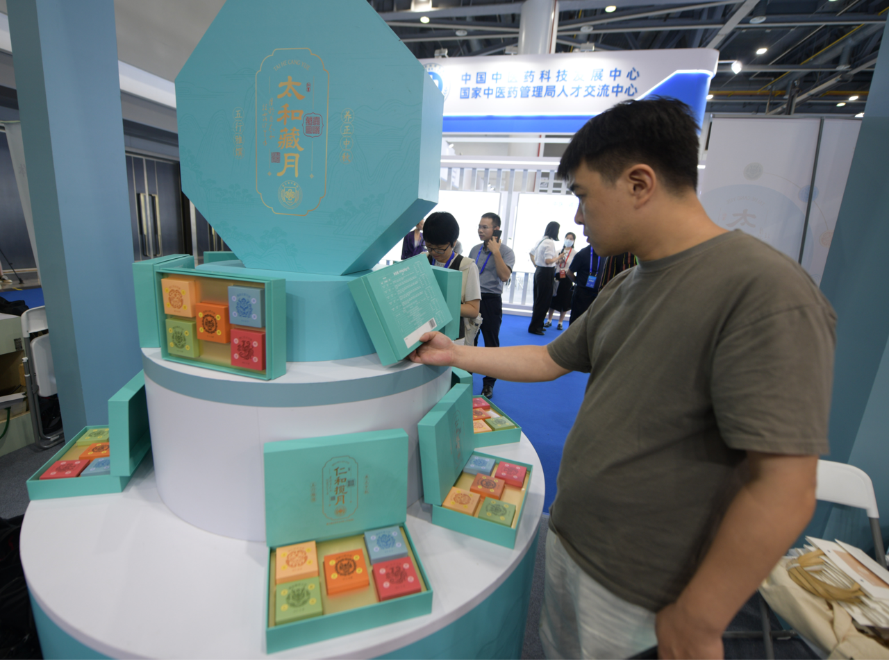 消费者在中医药创新成果展上了解浙江省中医院出品的“五行药膳月饼”。受访者供图