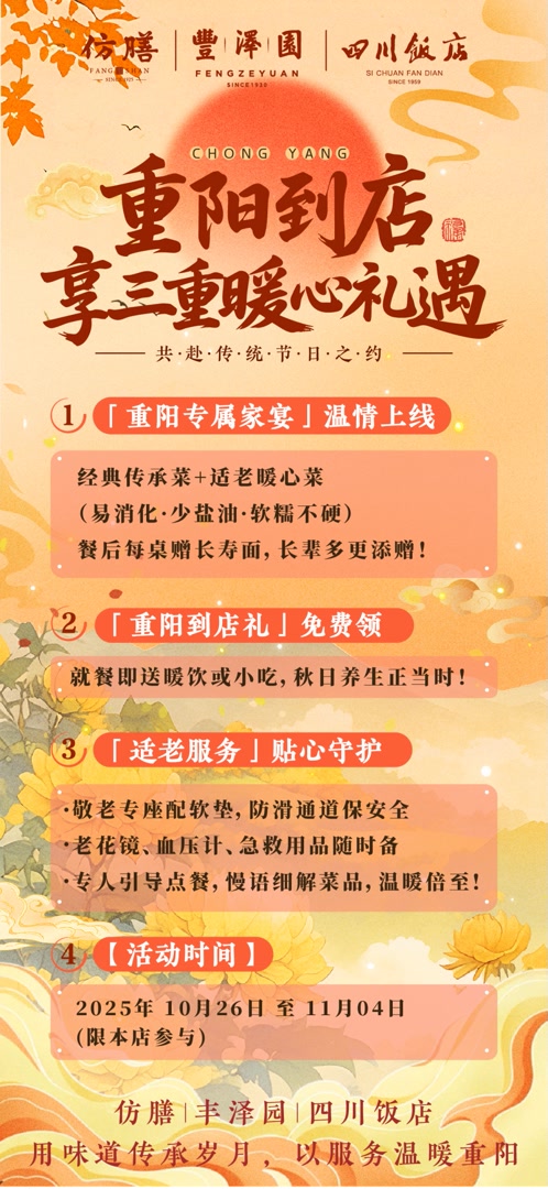 岁岁重阳,暖意浓。为传承敬老传统、满足老年群体节日情感需求,全聚德集团旗下仿膳、丰泽园及四川饭店三大老字号餐饮品牌于2025年10月26日至11月4日携手推出“岁月滋味,重阳暖家宴·寿宴庆安康”主题活动。此次活动以“敬老暖心、家庭欢聚”为核心,通过专属套餐、到店赠礼、适老服务、特色寿宴等多重举措,为老年顾客及家庭打造温馨、贴心的节日用餐体验,续写品牌“有温度、重传统”的时代篇章。