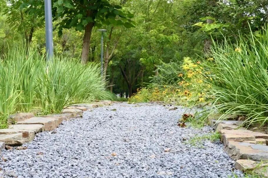 值得一提的是,主步道周围还延伸出多条碎石和洗米石小道,蜿蜒穿梭在花丛和林木之间,形成了富有设计感和舒适感的“阳光碎石花园”。在这里,阳光、绿意、树影与砂石细碎的声音交织在一起,松弛感满满~