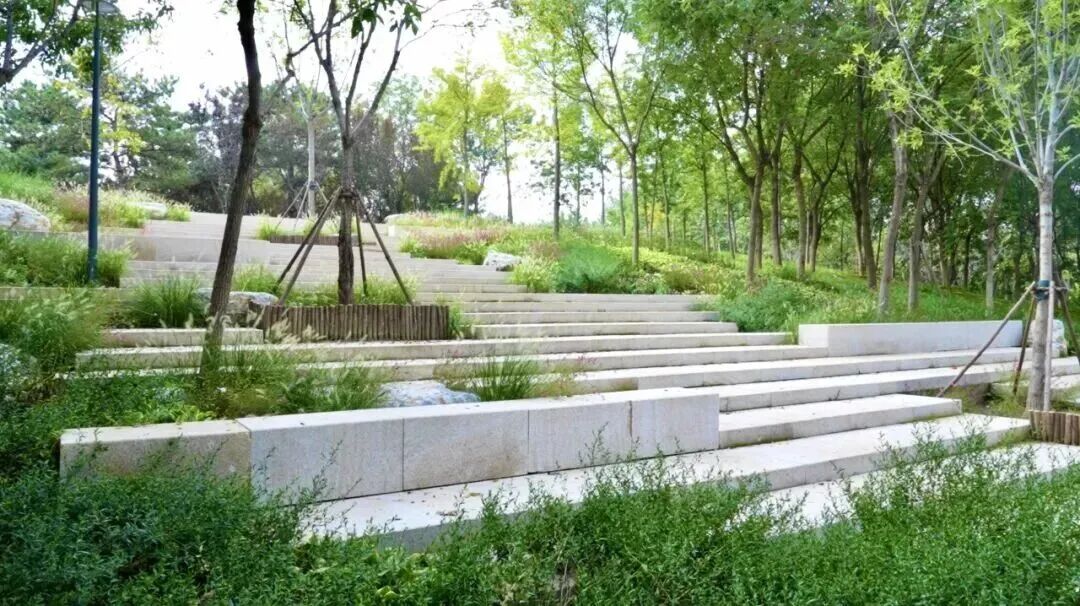 从休闲园北侧入园,便能看见有着35层台阶的台地广场,通过台阶便可轻松入园。整个台阶中间采用荔枝面黄锈石花岗岩设计了休息石凳,周边栽种了花卉,中间保留原有乔木,夏季绿树成荫,赏花休闲乘凉一站满足。