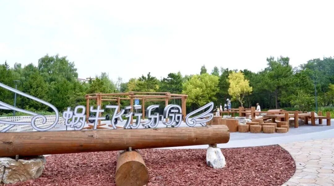 休闲园内最具特色的当属蜗牛飞行乐园,整个乐园从上方看,就像是一只蜗牛。这里巧妙地利用废弃的枯树、枯枝、落叶和旧轮胎,打造了木凳、木桩爬架、秋千和台阶式休闲座椅等设施。通过生态材料与仿生设计的结合,创造了一个既有趣又富有互动性的亲子休闲空间。特别的是,秋千采用蜗牛形状的轮胎设计,独特的造型深受孩子们喜爱。