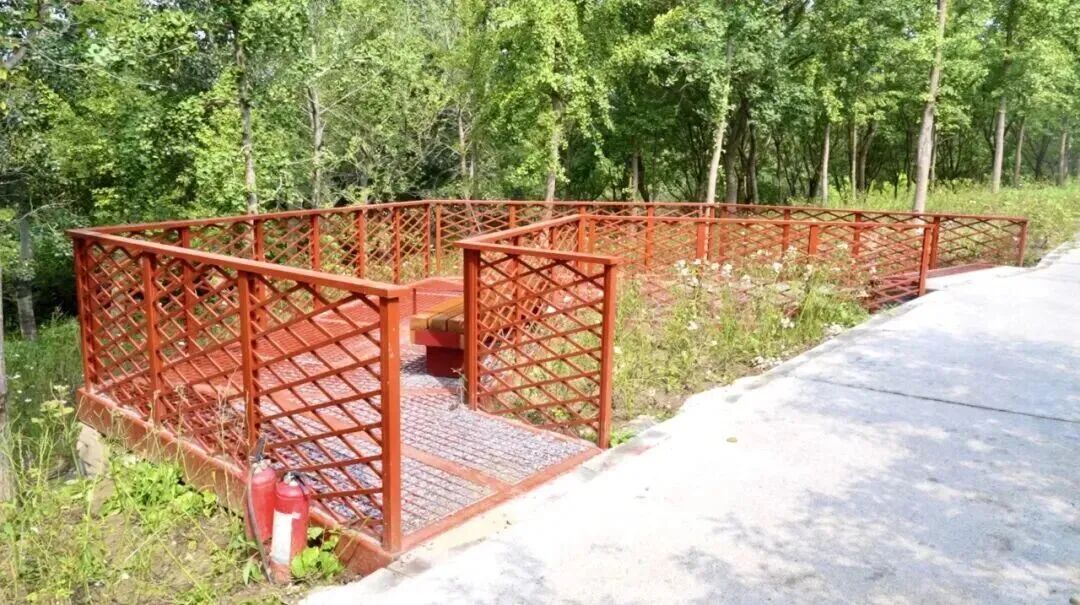 由红色钢结构打造的瞭望台格外引人注目,面积28平方米,台上还设有舒适的休闲座椅,方便行人休息。