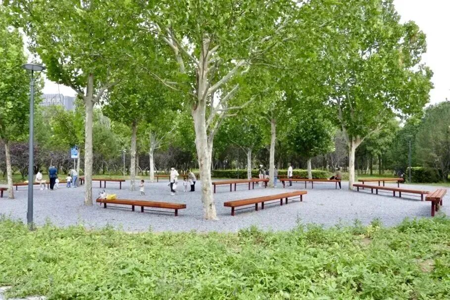 法桐迷宫的设计灵感来自园内的一片椭圆形空地,依托现有的法桐树林,环绕式地布置了休憩座椅,形成了一条迷宫般的路径。树冠的遮荫与木质座椅的搭配,营造出一个舒适宜人的林间漫游空间。