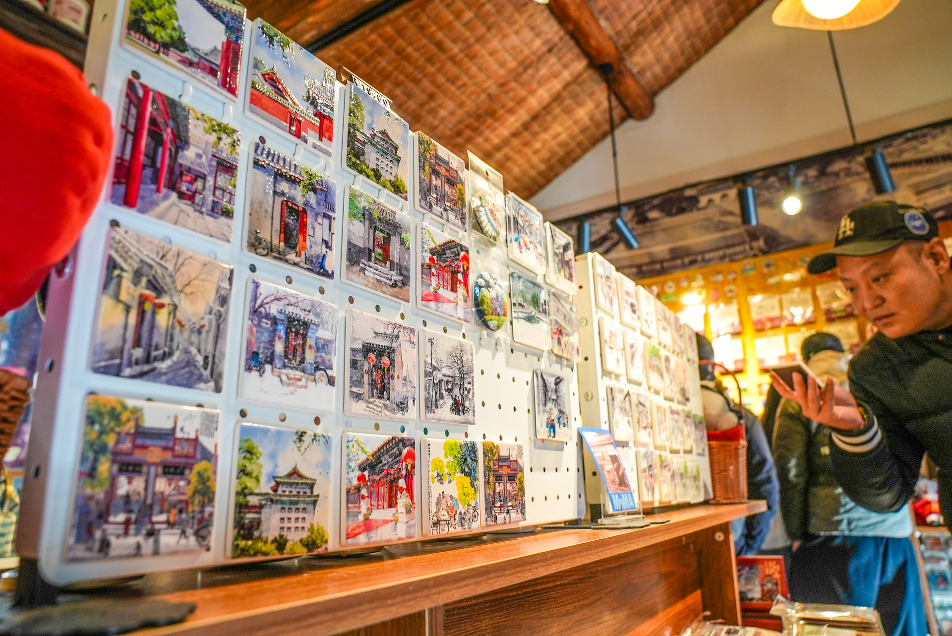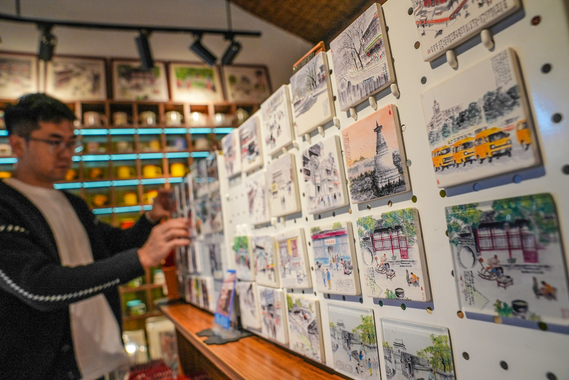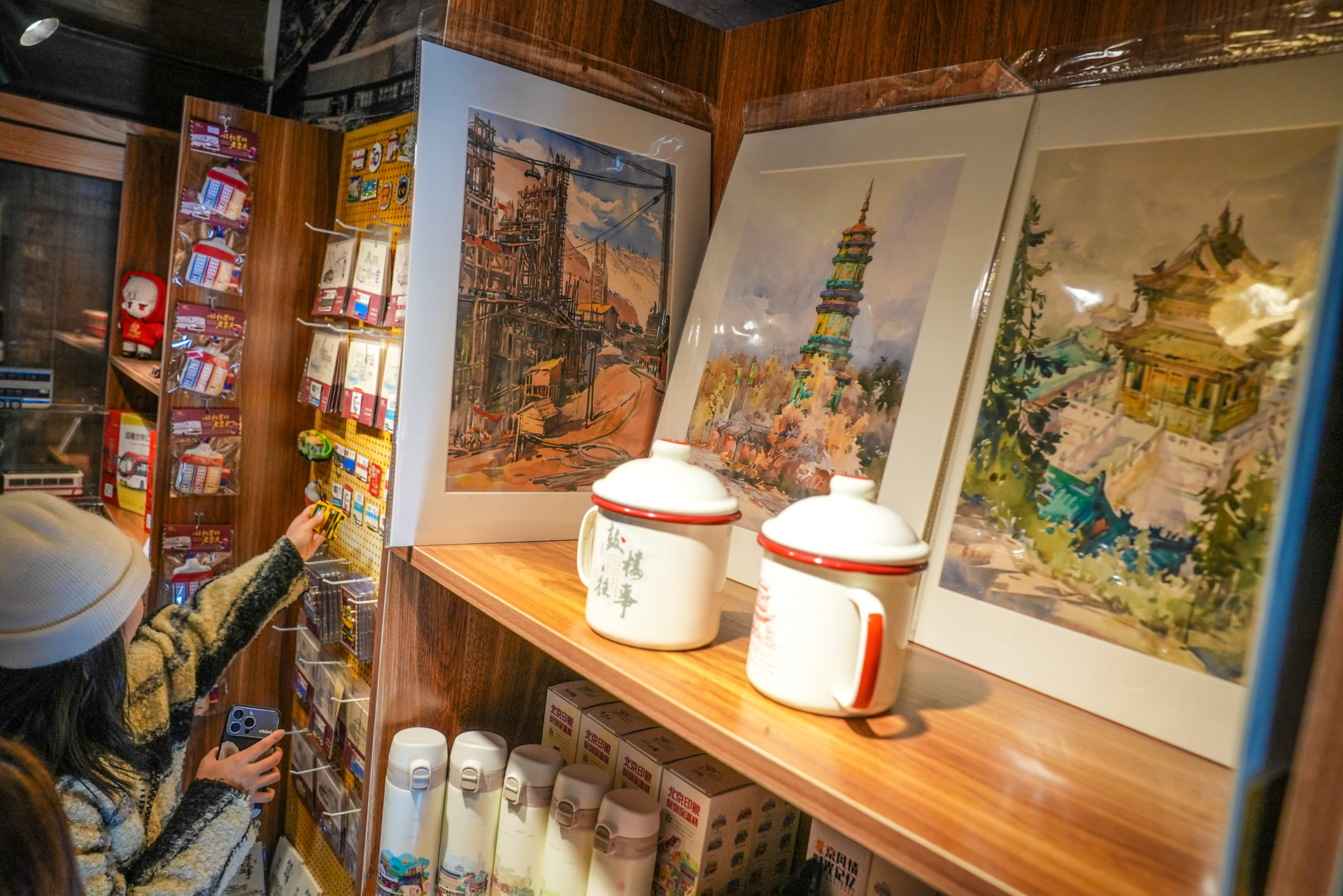 “京味拾光”今年3月开业,靠着“独家定制款”,收获大批拥趸。入秋,气温走低,货架上立马多了很多“秋味”。一款白塔寺主题水彩复制画,书本大小,装帧精美,售价每幅38元,画面中的建筑古香古色、白蜡树披着金叶,色调柔和不刺眼。“这种小画在其他店没怎么见过。看到它,就想起北京的秋天,比单纯印个白塔的冰箱贴有味道、耐看。”一位购买者评价。