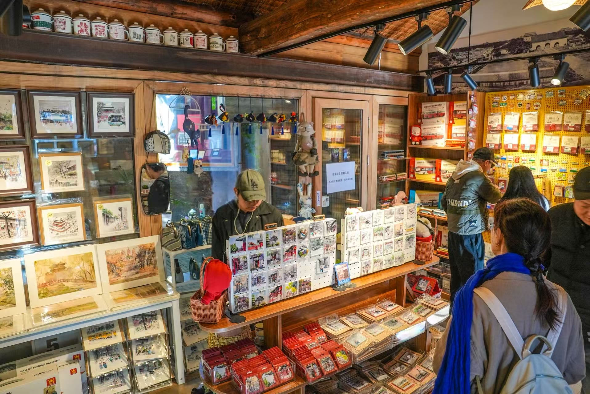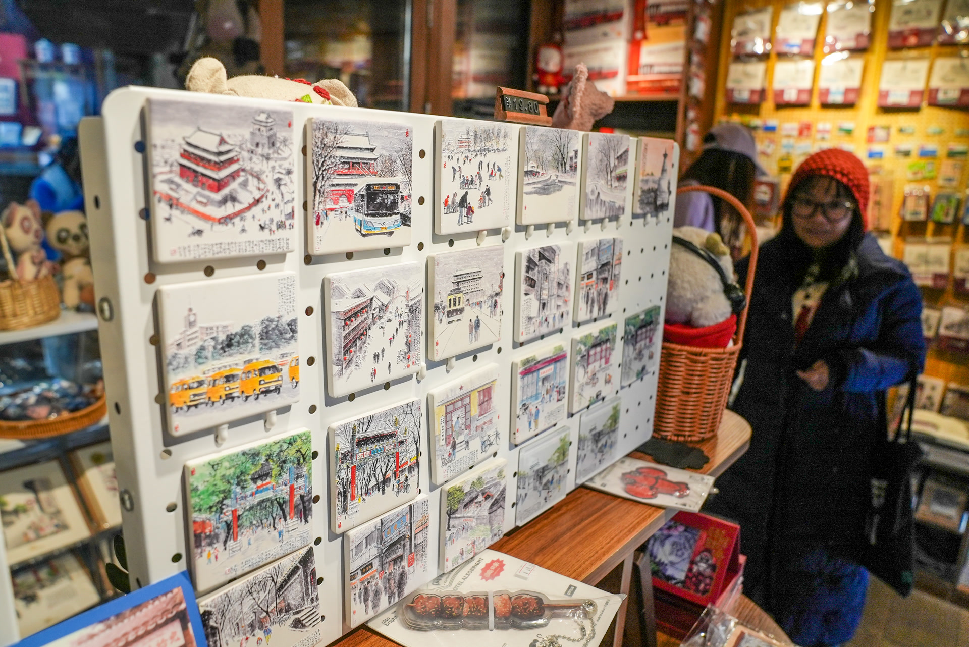 站牌冰箱贴、公交车积木、胡同故事手账本、北京水彩复制画……全市首个“北京礼物”京味文化主题店“京味拾光”,藏在青砖灰瓦的杨梅竹斜街里,是家售卖区只有21平方米的文创小店,几百款产品都是坚持原创的“独家定制款”。