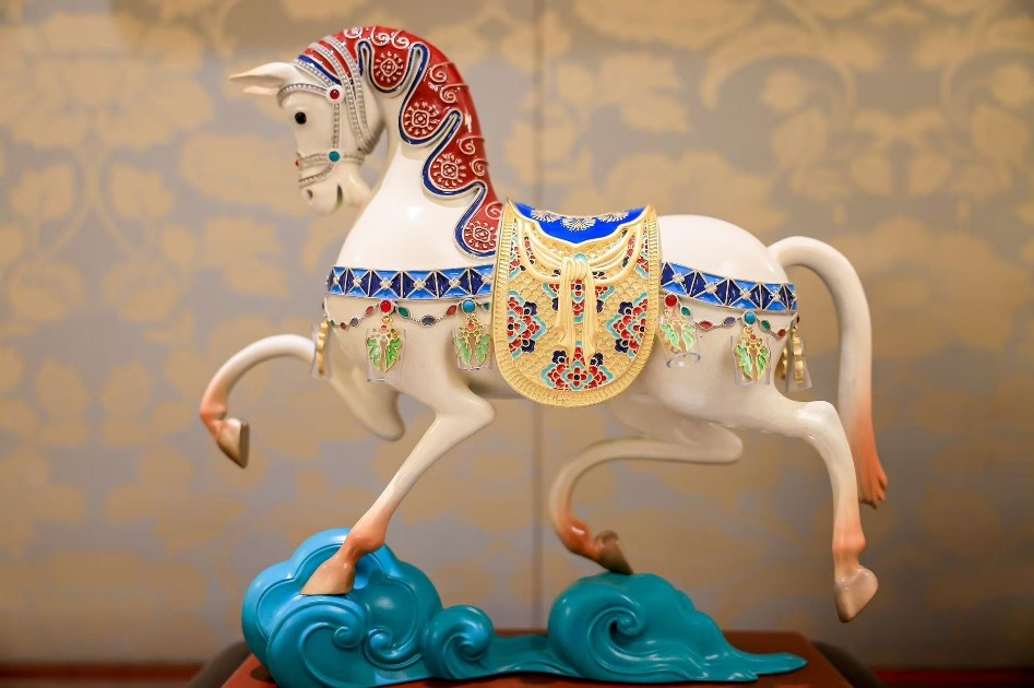 天马脚踏祥云,矫健奔腾……常沙娜与铜雕大师朱炳仁联合创作的珐琅铜雕作品《霓裳天马》是此次展览的明星展品。这尊铜雕以莫高窟第257窟 “挽车天马” 为灵感,融合传统珐琅工艺与现代铜雕技术,造型庄重流畅,珐琅流光溢彩,既显飞天神韵,又寓意青云直上、前程万里。这件作品汇集手工珐琅、金属铸造、花丝烧蓝、宝石镶嵌等多项非遗技艺,展示了中国传统工艺与丝路文明的独特风采。