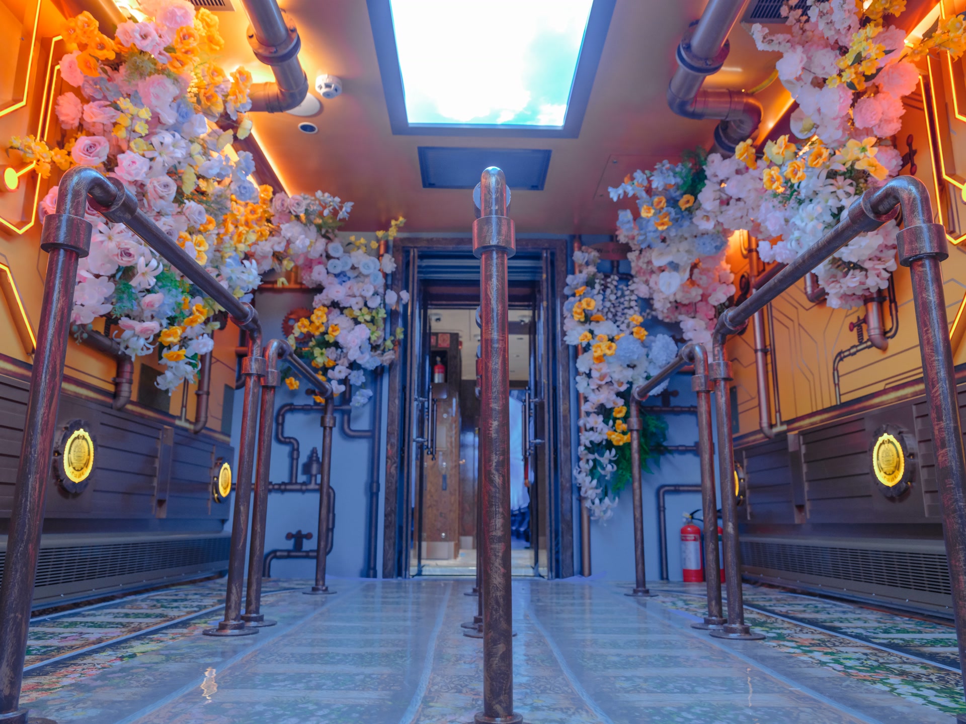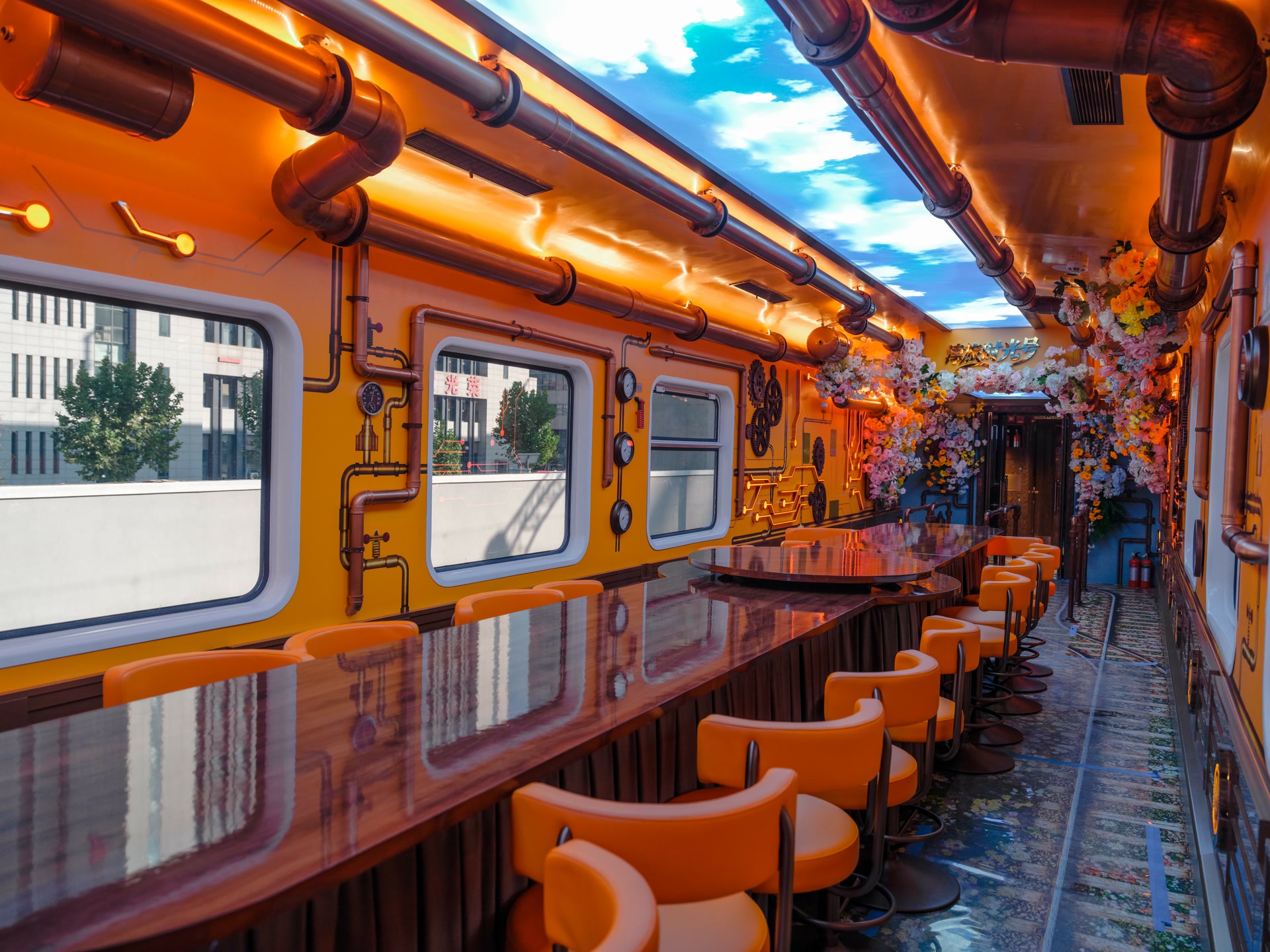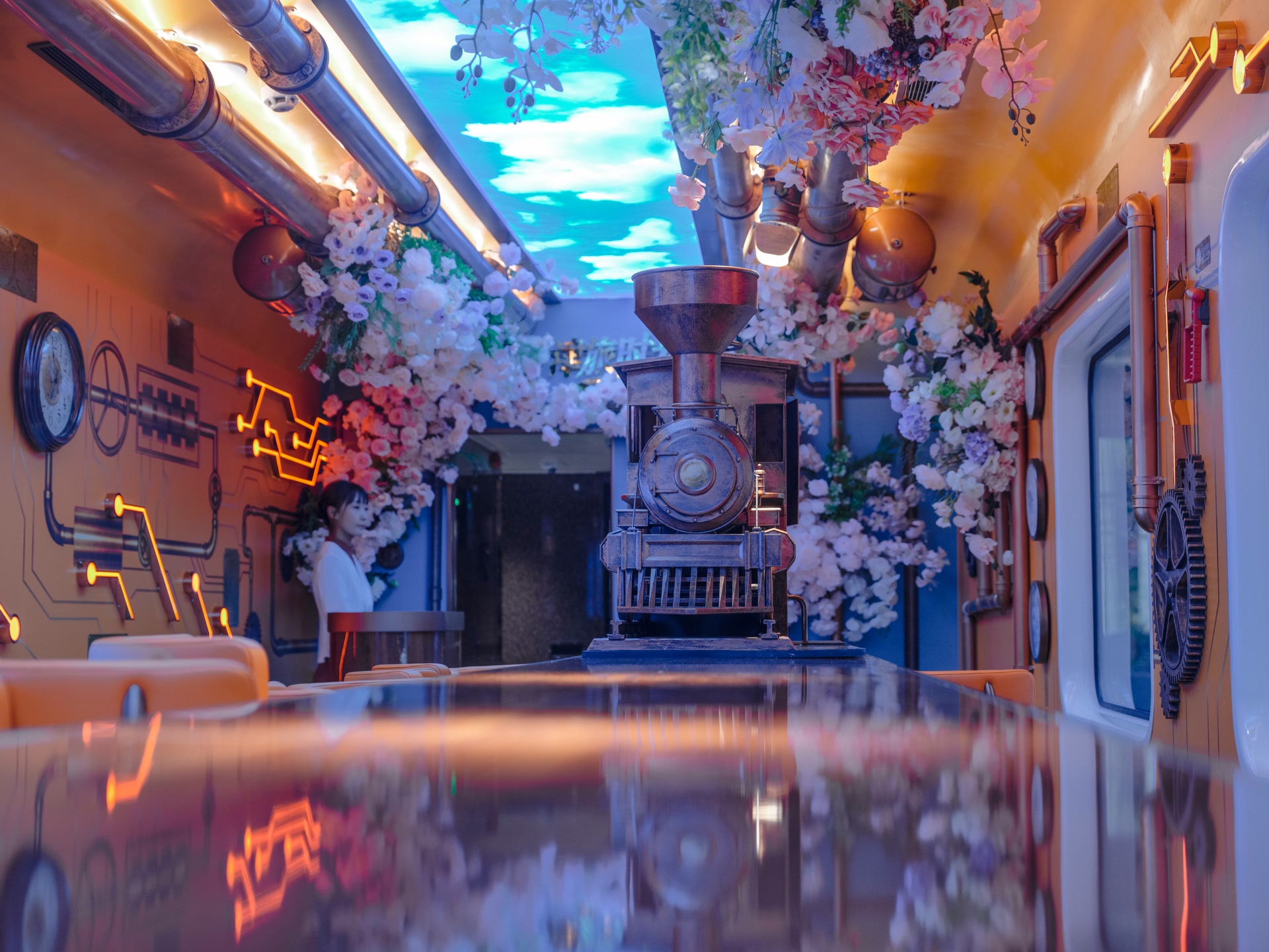 列车共设10节主题鲜明的特色车厢:分为复古客座车厢、蒙太奇幻境互动演艺车厢、珍奇花园俱乐部车厢、沉浸式时空穿梭机车厢以及专属VIP车厢,均以沉浸式戏剧化空间为理念,将座椅拆分重组,每节车厢形成互动或演艺区,配备移动舞台、隐藏灯轨和环绕音响。座椅、地面及软装材料兼顾安全与舒适,同时配备冷暖气系统、移动吧台和多功能储物柜,提供全方位的互动体验。
