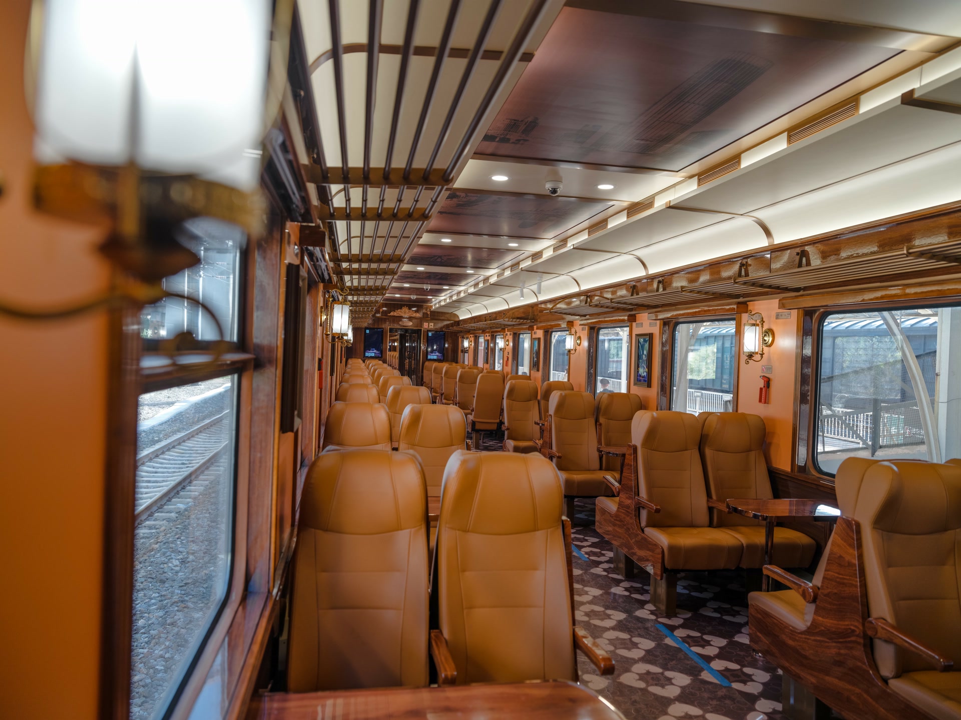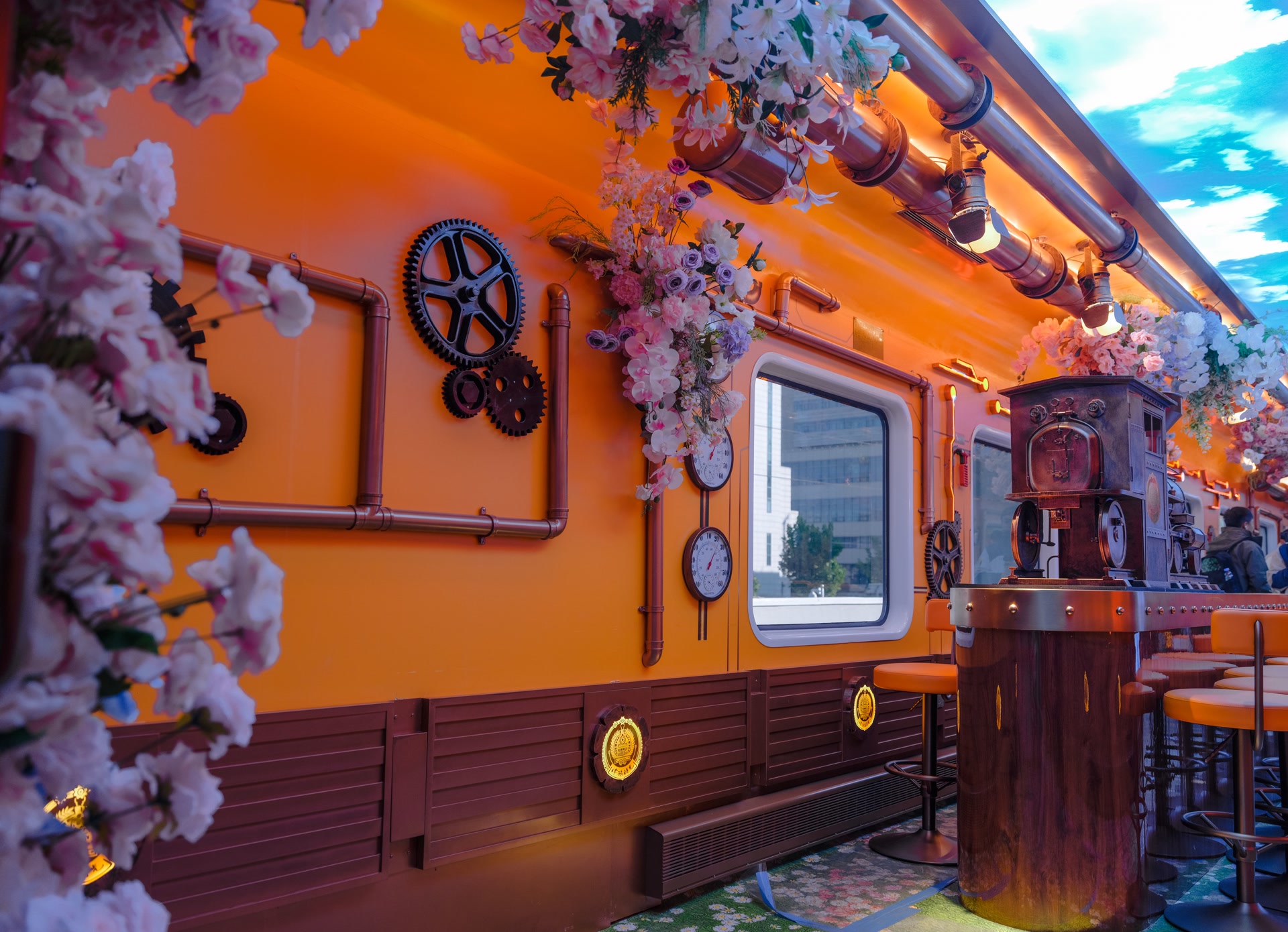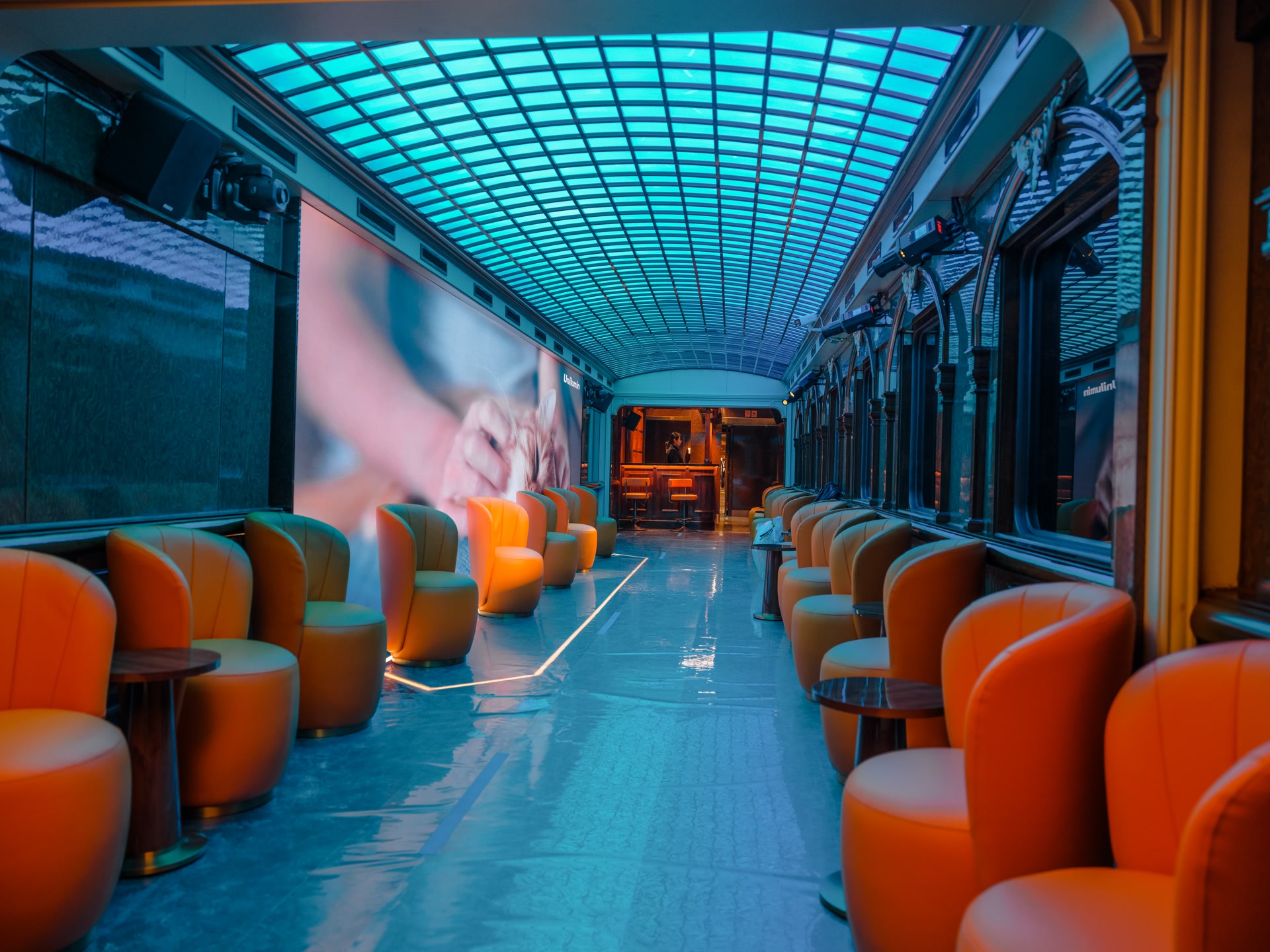 列车共设10节主题鲜明的特色车厢:分为复古客座车厢、蒙太奇幻境互动演艺车厢、珍奇花园俱乐部车厢、沉浸式时空穿梭机车厢以及专属VIP车厢,均以沉浸式戏剧化空间为理念,将座椅拆分重组,每节车厢形成互动或演艺区,配备移动舞台、隐藏灯轨和环绕音响。座椅、地面及软装材料兼顾安全与舒适,同时配备冷暖气系统、移动吧台和多功能储物柜,提供全方位的互动体验。