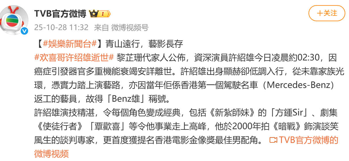 TVB官方微博发文悼念许绍雄:青山远行,艺影长存