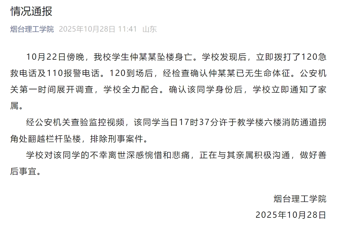 烟台理工学院10月28日通报,10月22日傍晚,学校学生仲某某坠楼身亡。学校发现后,立即拨打了120急救电话及110报警电话。120到场后,经检查确认仲某某已无生命体征。公安机关第一时间展开调查,学校全力配合。确认该同学身份后,学校立即通知了家属。
