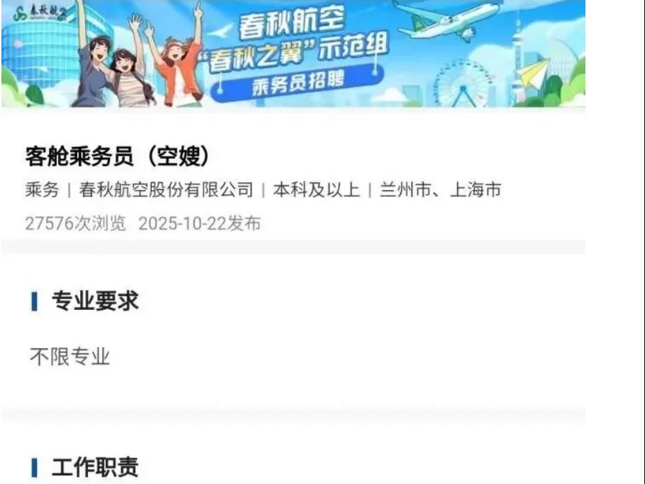 “希望突破传统空乘招聘的年龄壁垒,为已婚已育女性开启职业发展新篇章。”近日,春秋航空发布客舱乘务员“空嫂”兰州专项招聘计划,将招聘空姐的年龄放宽至40岁。