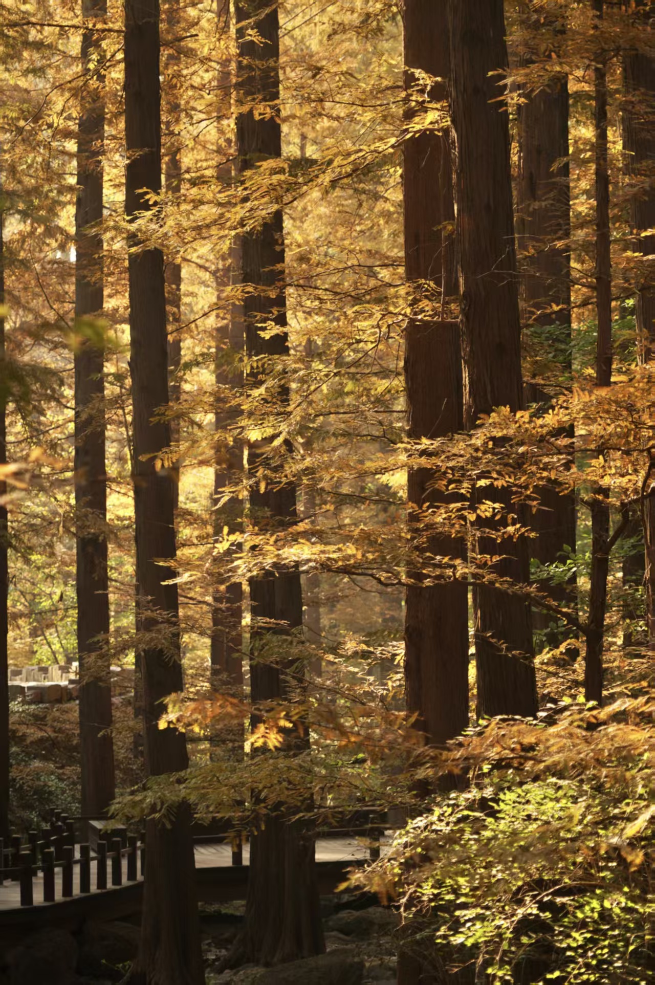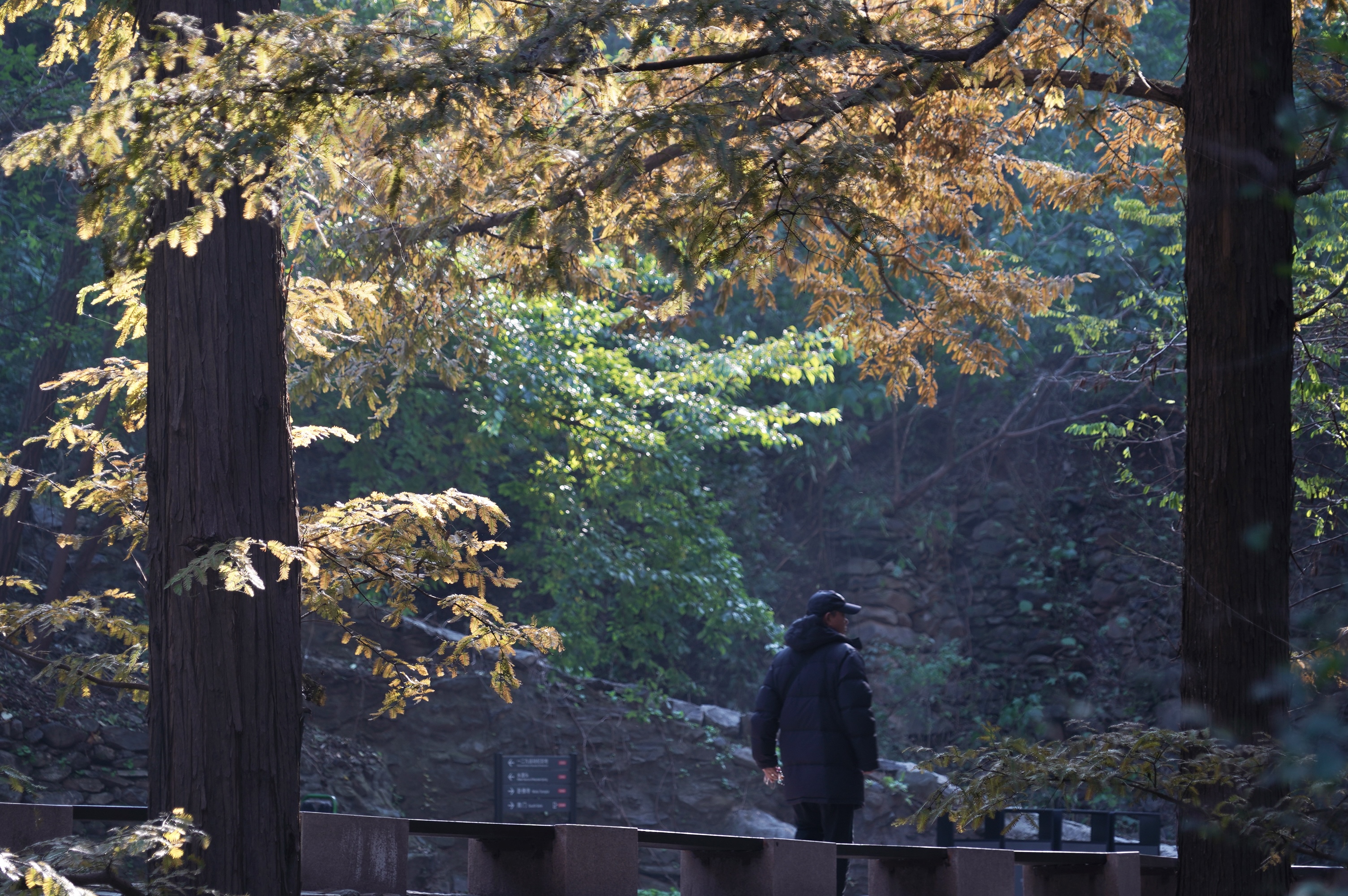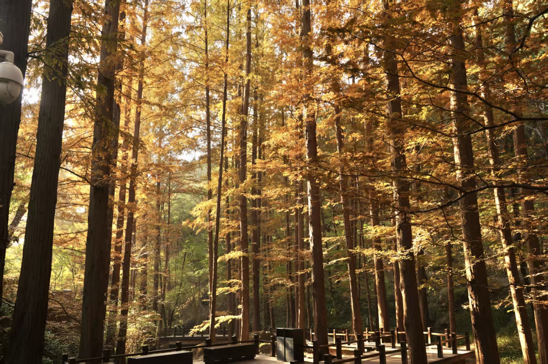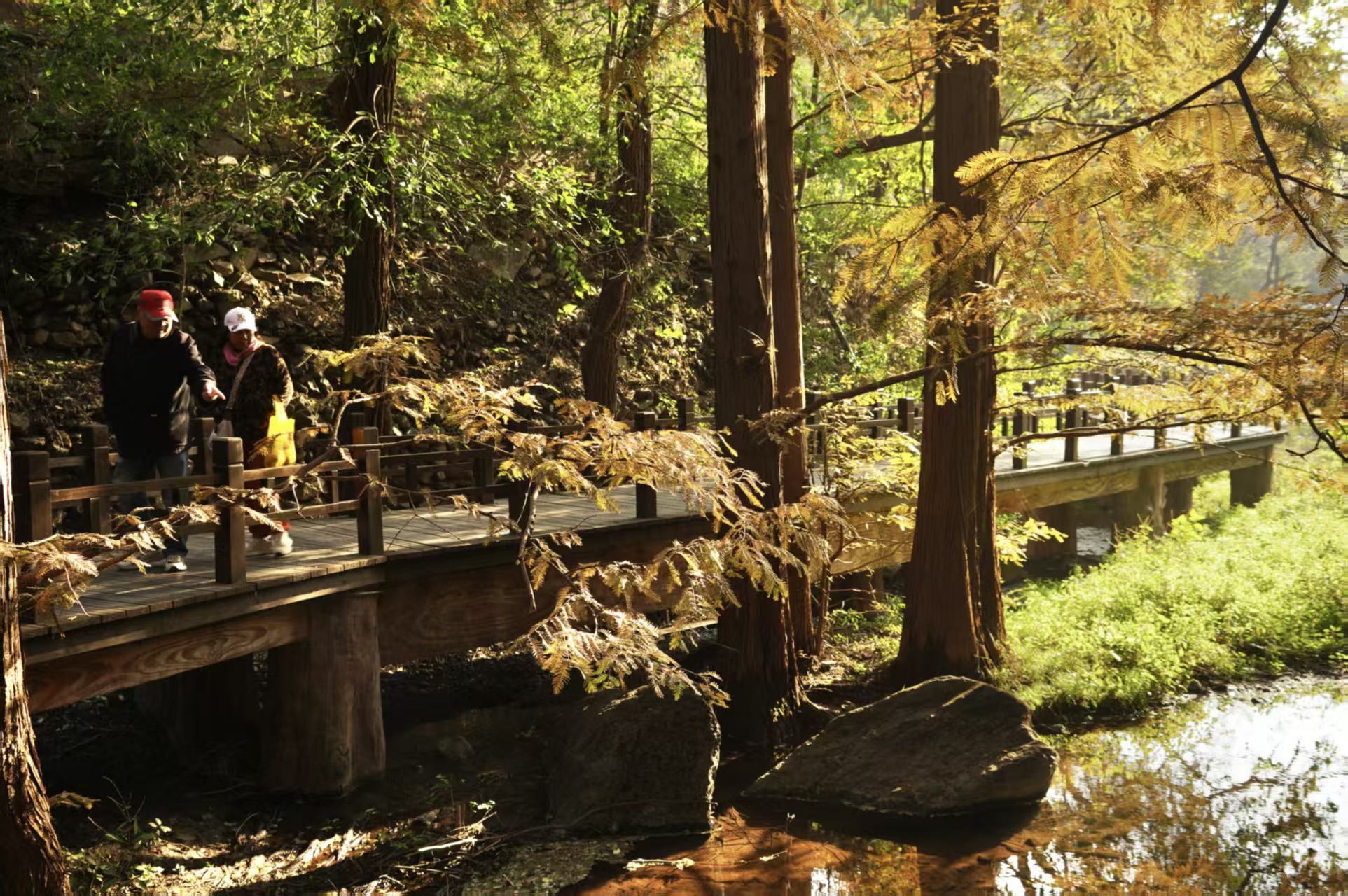 作为华北地区面积最大的水杉人工林之一,樱桃沟的水杉林不仅是秋日美景担当,更是重要的植物科普活课堂。水杉是国家一级重点保护野生植物,属于第四纪冰川遗留下来的 “活化石” 物种,其树干通直挺拔,最高可达 40 余米,线形的叶片呈羽状排列,入秋后因温度降低,叶绿素分解,类胡萝卜素等色素显现,造就了层次丰富的色彩变化。