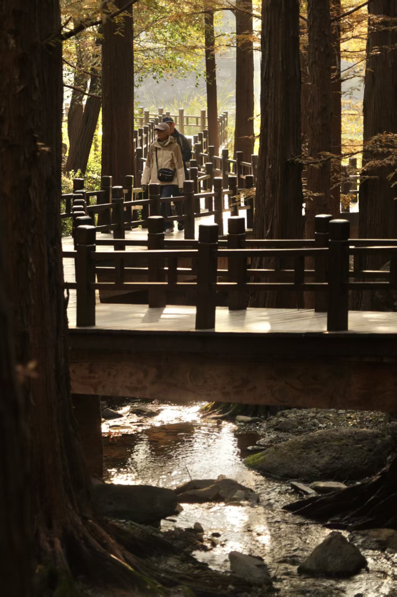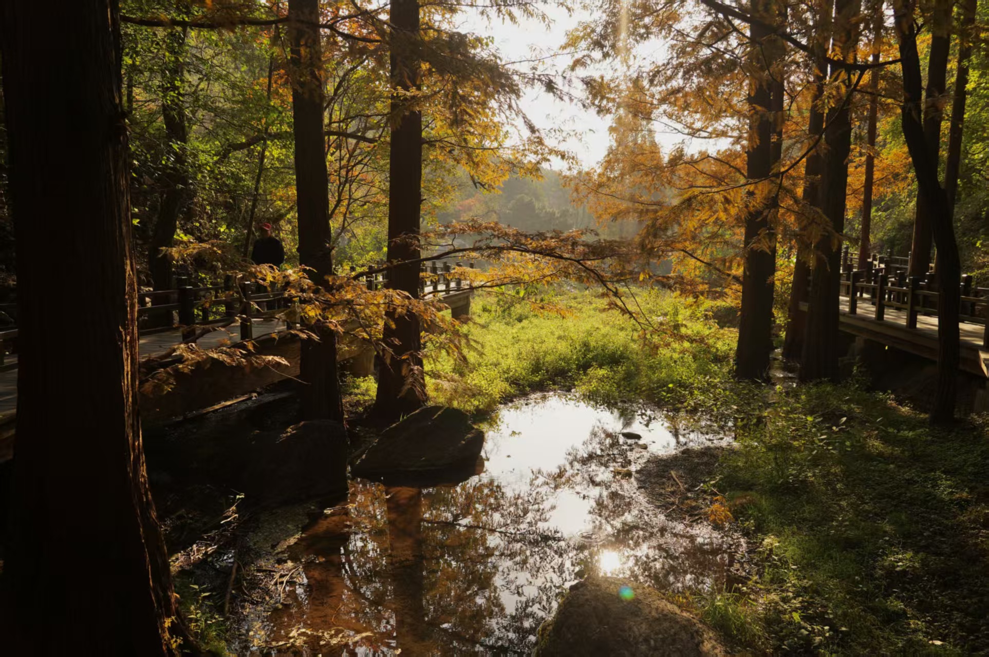 漫步林间,脚下是松软的落叶层,耳畔是鸟鸣与溪流声,抬头可见阳光透过枝叶形成的丁达尔效应,橙红色的水杉与清澈的樱桃沟溪流相映成趣,构成一幅动静结合的秋日生态画卷。
