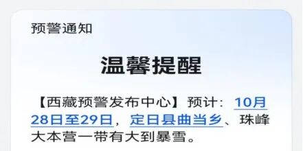 根据《西藏预警发布中心》、《定日县气象局暴雪黄色预警》发布的暴雪预警及28日早上珠峰景区受降雪天气影响,景区境内部分路段出现积雪结冰等现象,能见度低,不具备车辆通行条件,为了进一步保证您在旅行期间的安全,确保您安全而来,平安而归,珠峰景区于2025年10月28日12时30分开始停止售票,实行临时封闭,目前正在紧急道路疏通中,对此造成不便,敬请谅解。请广大游客提前调整行程安排,景区恢复开放及售票时间将通过官方渠道另行通知。请游客朋友提前规划时间。