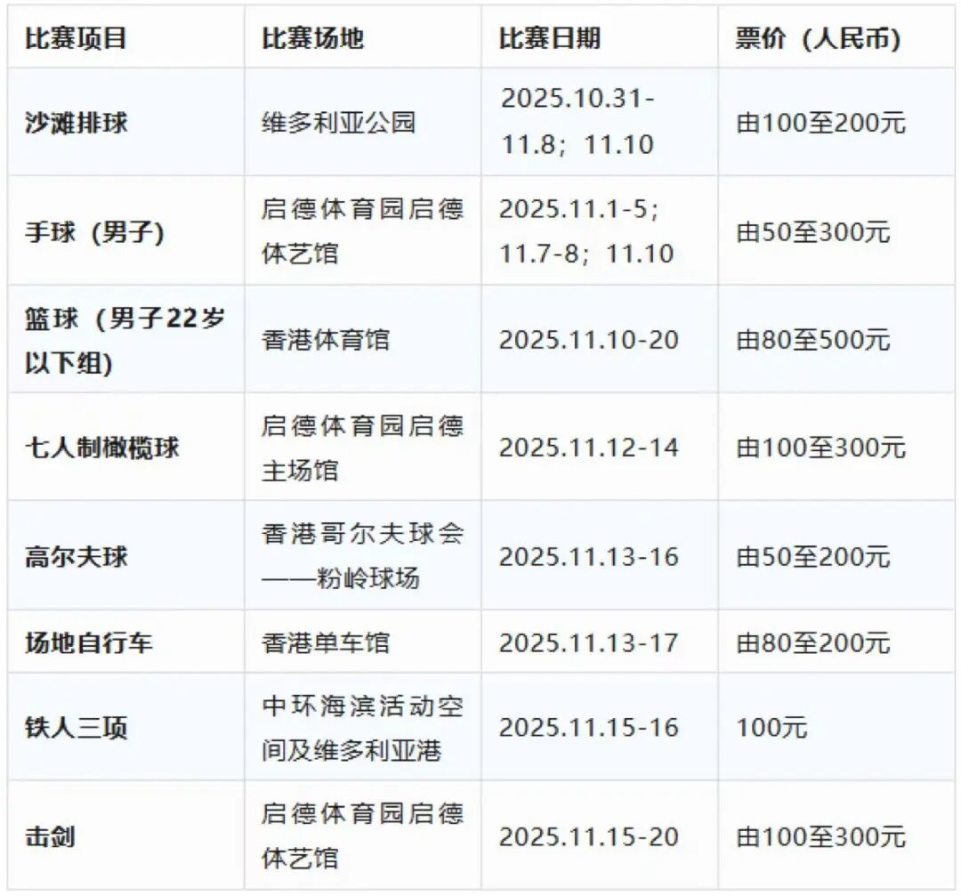 香港赛区门票以“半日通”或“全日通”形式发售,整体票价亲民。十五运会项目最低票价人民币50元,残特奥会项目则全为单一票价人民币20元。有兴趣人士可登录官方票务网站,或在微信搜寻“十五运会官方票务”和“2025残特奥会官方票务”小程序,了解更多。