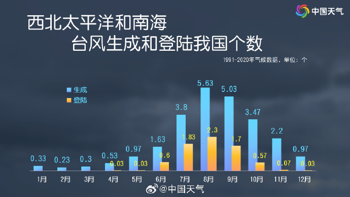 常年来看,11月西北太平洋和南海上的台风活跃程度虽不如7至9月,但仍有台风生成和登陆的记录,平均有2.2个台风生成,多于6月。