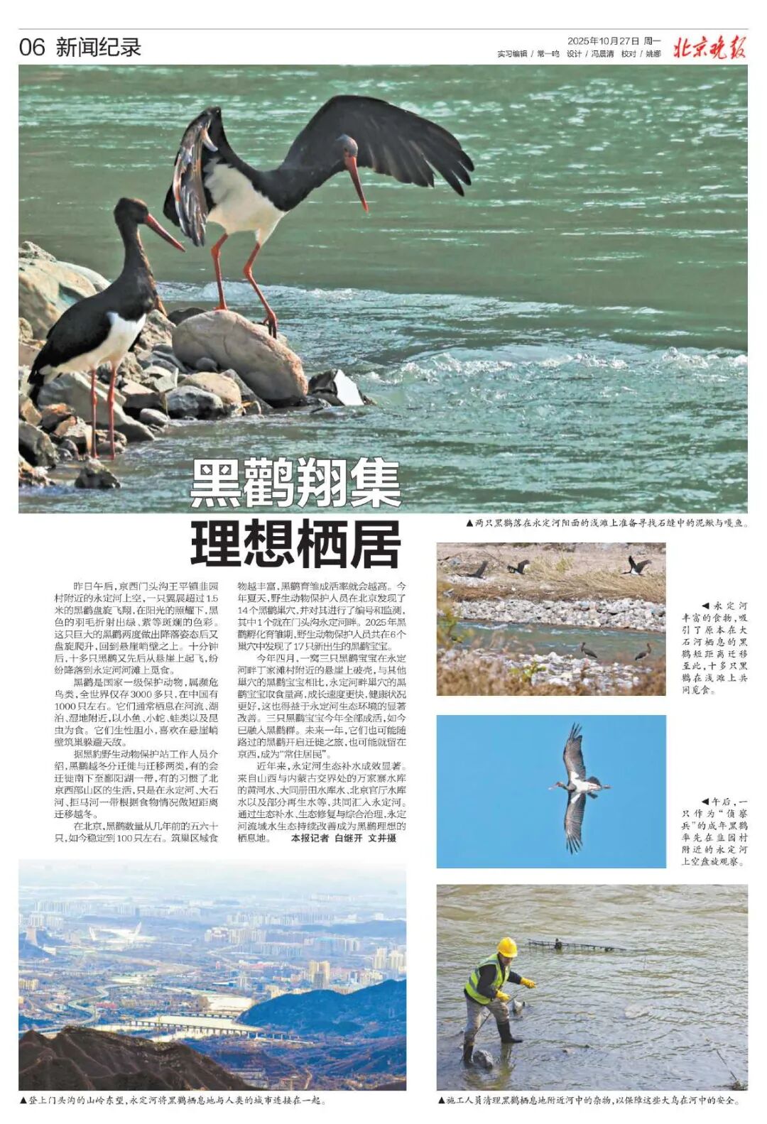 今年四月,一窝三只黑鹳宝宝在永定河畔丁家滩村附近的悬崖上破壳,与其他巢穴的黑鹳宝宝相比,永定河畔巢穴的黑鹳宝宝取食量高,成长速度更快,健康状况更好,这也得益于永定河生态环境的显著改善。三只黑鹳宝宝今年全部成活,如今已融入黑鹳群。未来一年,它们也可能随路过的黑鹳开启迁徙之旅,也可能就留在京西,成为“常住居民”。