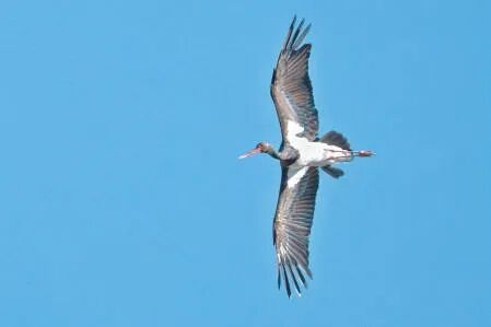 黑鹳是国家一级保护动物,属濒危鸟类,全世界仅存3000多只,在中国有1000只左右。它们通常栖息在河流、湖泊、湿地附近,以小鱼、小蛇、蛙类以及昆虫为食。它们生性胆小,喜欢在悬崖峭壁筑巢躲避天敌。