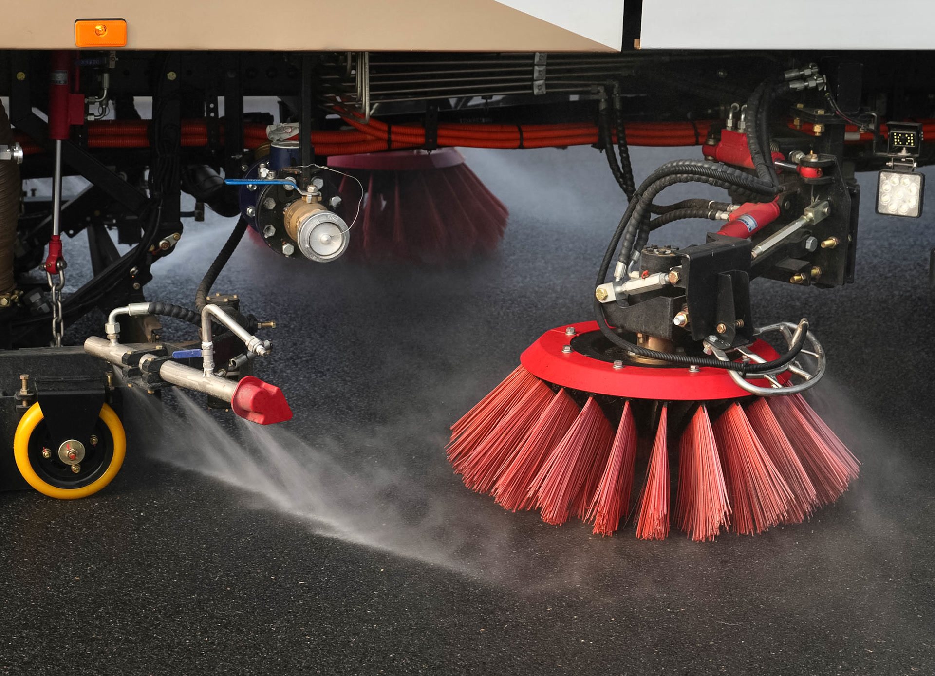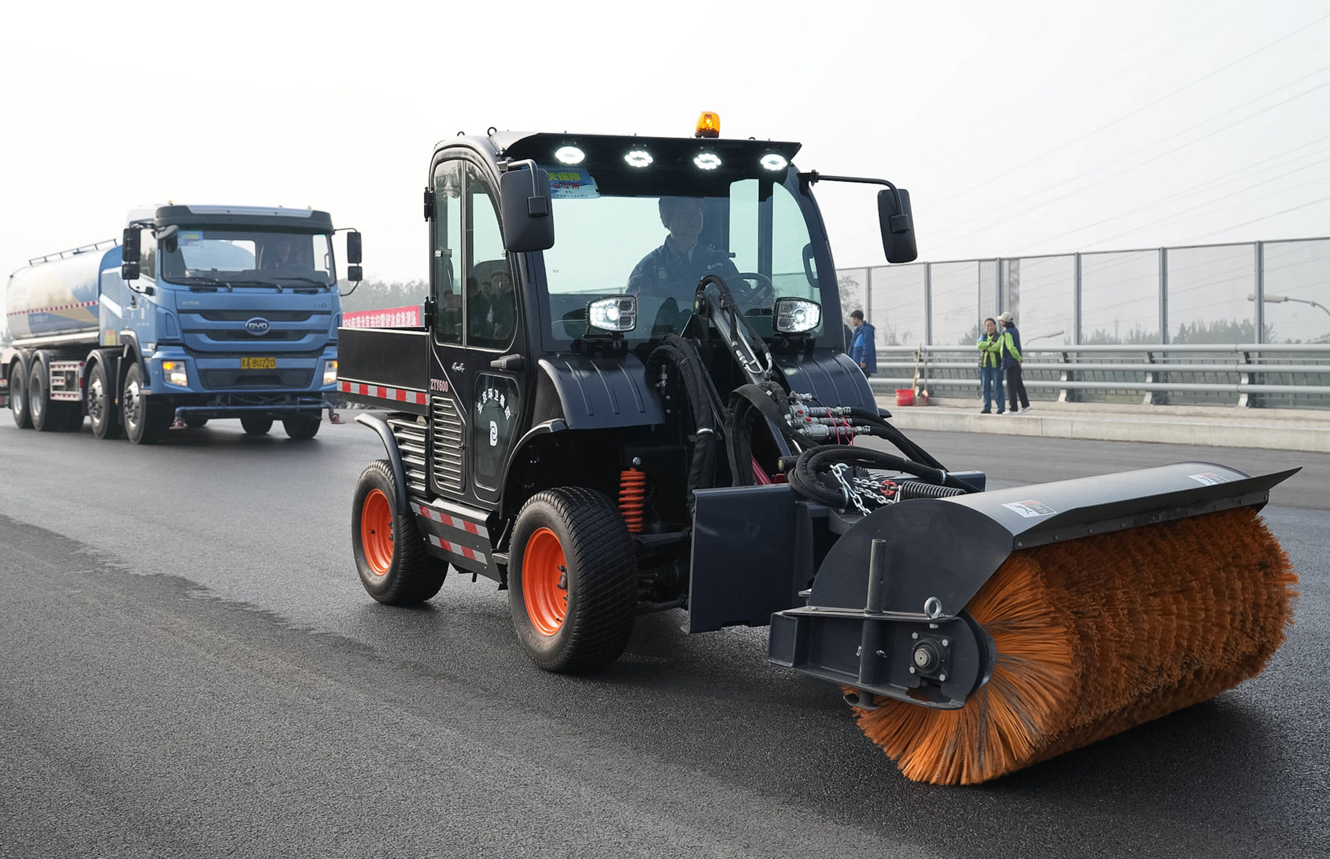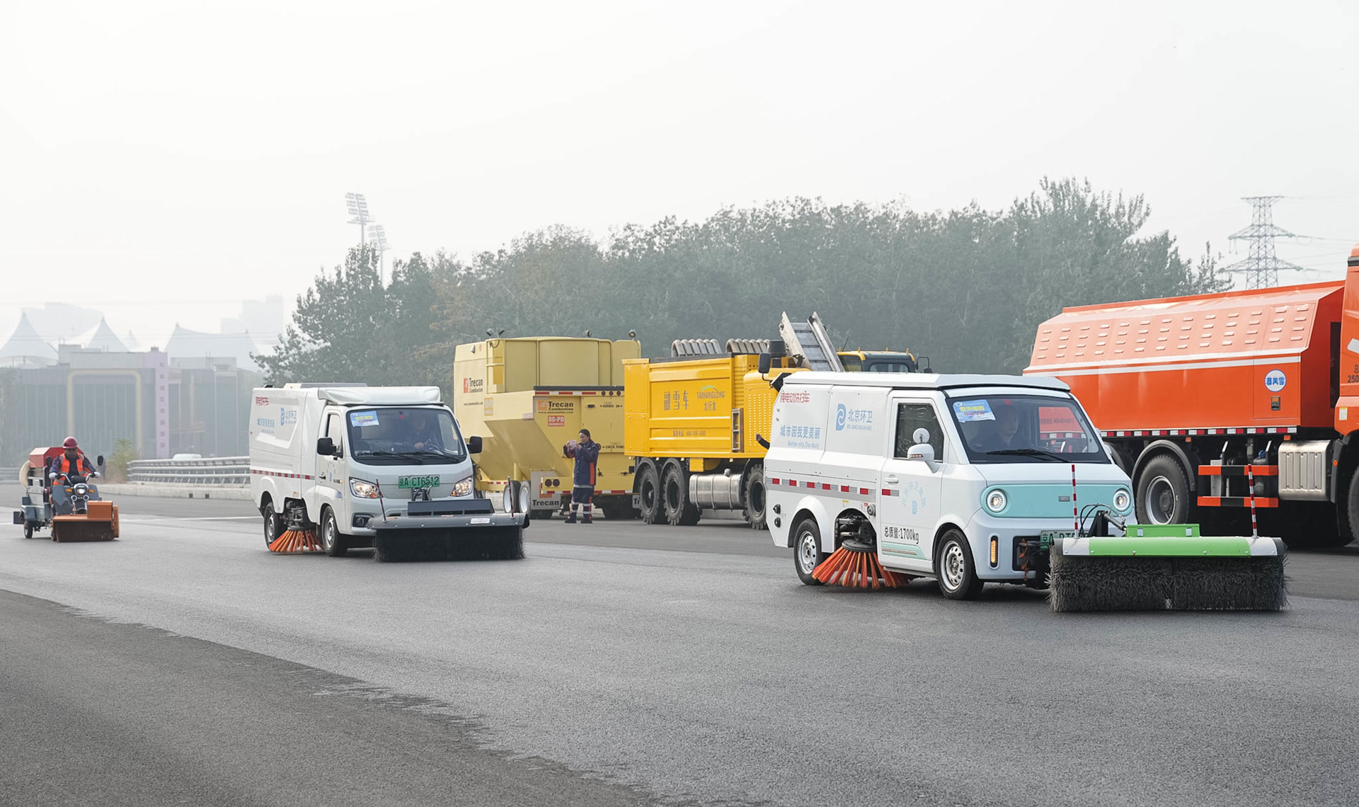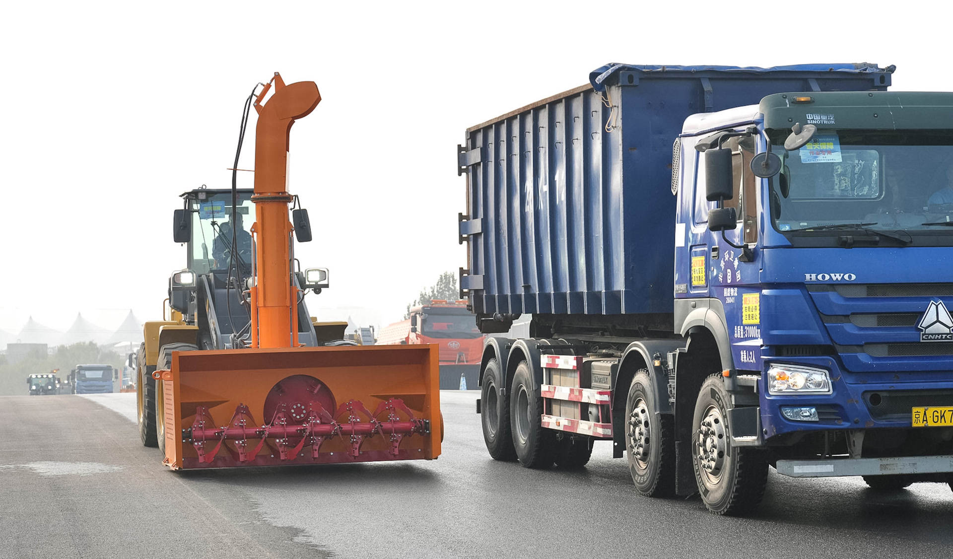 演练一开始,3辆装配自动力滚刷的洗扫车和1辆装配雪铲的多功能除雪车便率先驶入演练路段,利用滚刷和雪铲,压茬将道路积雪依次向右侧清理。