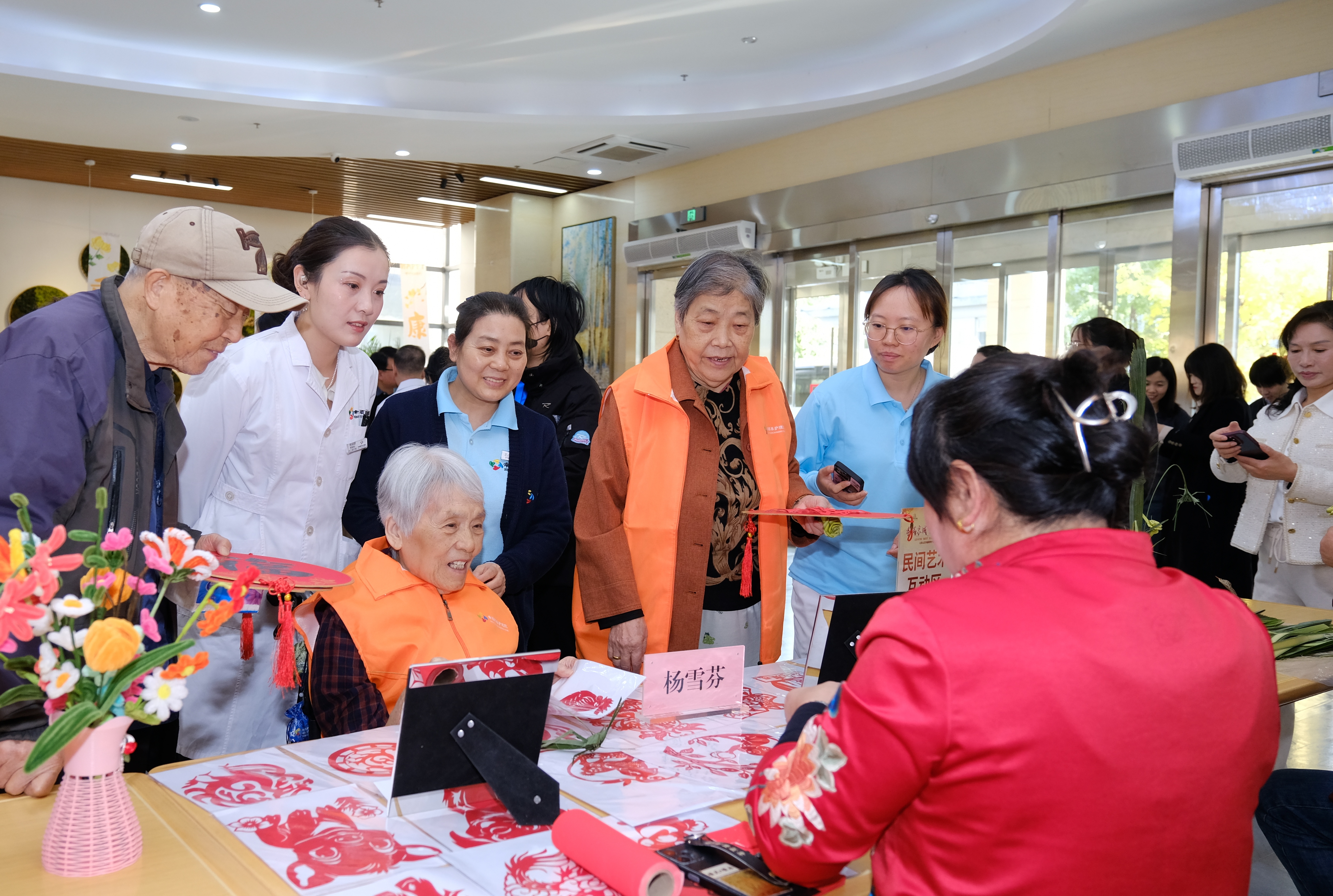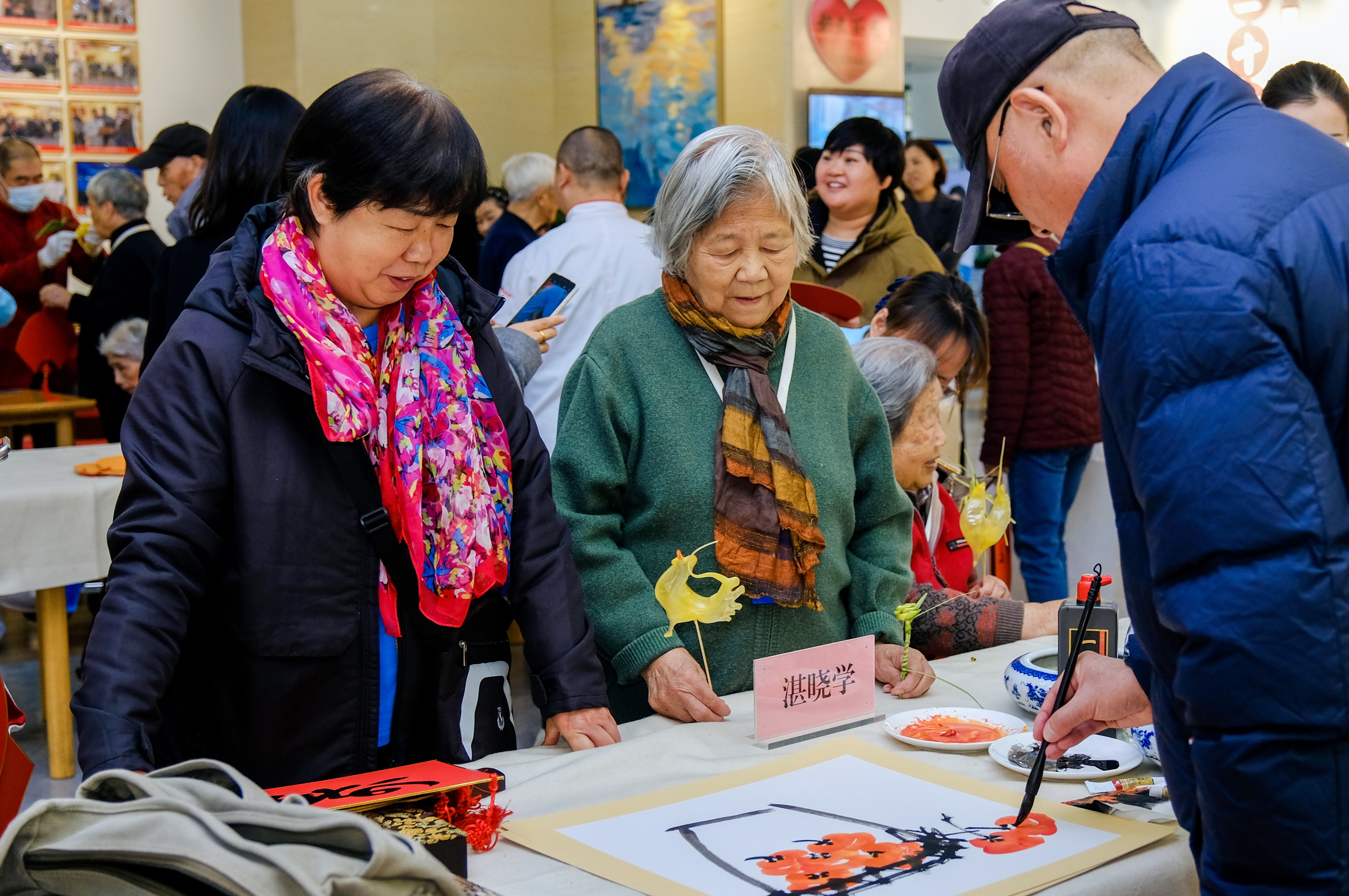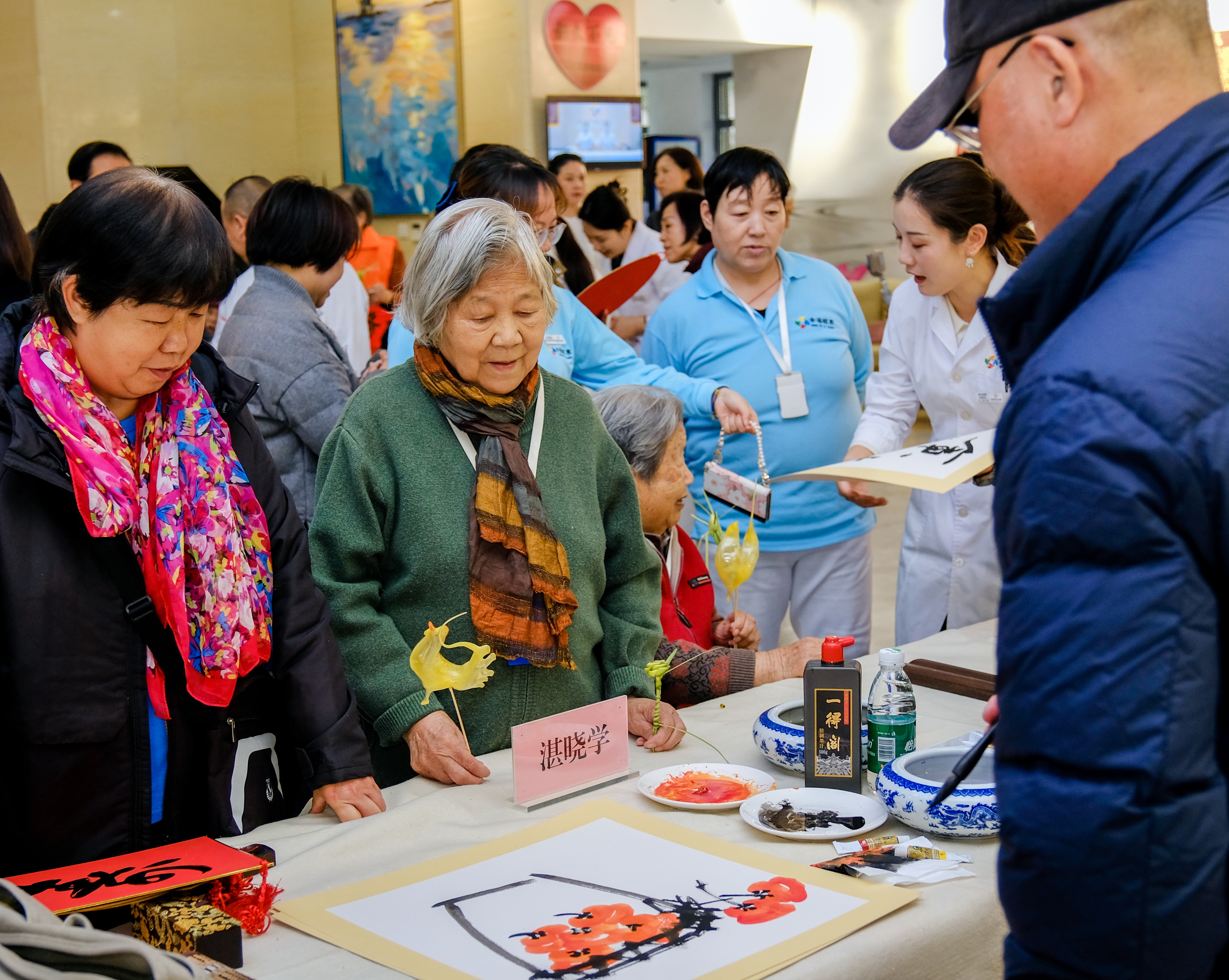 来自北京市书法家协会、北京市民间文艺家协会,以及石景山区书法家协会、美术家协会、民间文艺家协会的数十位艺术家齐聚现场,以笔墨传情、以文艺暖心,用充满文化底蕴的艺术形式,为广大老年群体送上最诚挚的节日问候与美好祝愿。活动现场暖意融融,文化氛围愈发浓厚。书画创作区里,艺术家们凝神挥毫,笔走龙蛇间,“福如东海”“寿比南山”“松鹤延年”等吉祥话语跃然纸上,墨香氤氲中寄托着对长者健康长寿、晚年幸福的深情祝福;吹糖人、草编、绒花、剪纸四项非遗技艺联袂亮相,老人们围坐其间,或驻足观赏,在指尖互动与视觉盛宴中感受传统文化的独特魅力。