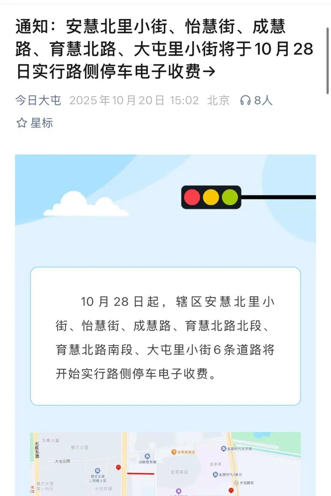 为保障周边居民停车需求,改善道路通行环境,依据《中华人民共和国道路交通安全法》《北京市机动车停车条例》,遵循“停车入位”“停车付费”“违停受罚”基本要求,经北京市交通委、朝阳区交通委备案同意,决定在安慧北里小街、怡慧街、成慧路、育慧北路北段、育慧北路南段、大屯里小街设置规范停车位,引入正规停车公司管理,实行停车收费。