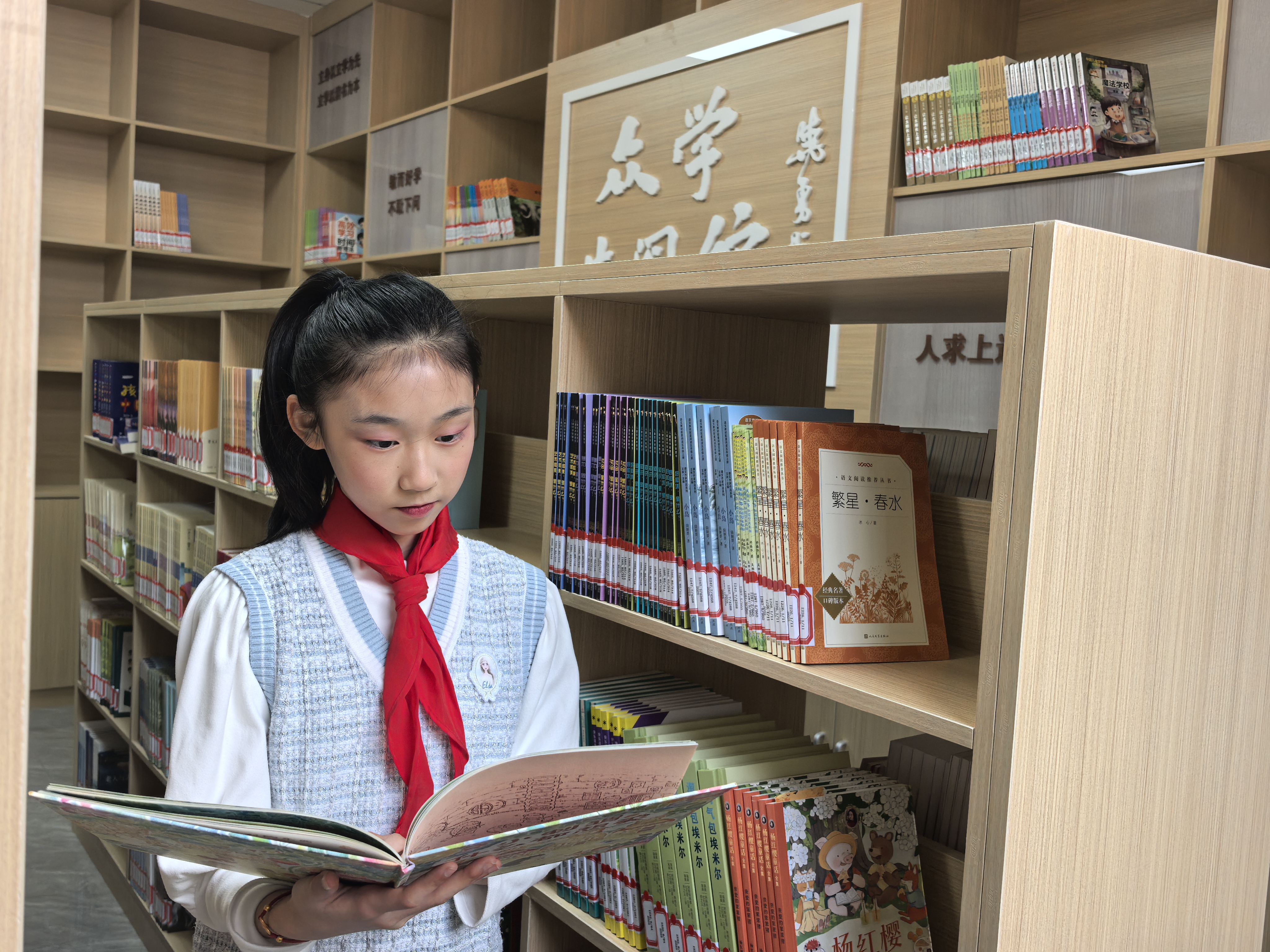 记者了解到,馆内现有藏书约5322册,涵盖文学、历史、地理等22个主要类别,能够为学生、教师、社区居民等读者提供丰富多样的阅读选择。周末向公众开放的具体时间从上午9:00至下午5:30,为读者提供便利的阅览与借阅服务。“‘众学共阅馆’成立后,我读书就更加方便了,我可以随时和小伙伴分享,周末还可以和家人一起来,特别期待以后能参与更多精彩的阅读活动。”五年级的戴嘉熹在课间拿着绘本阅读时说道。