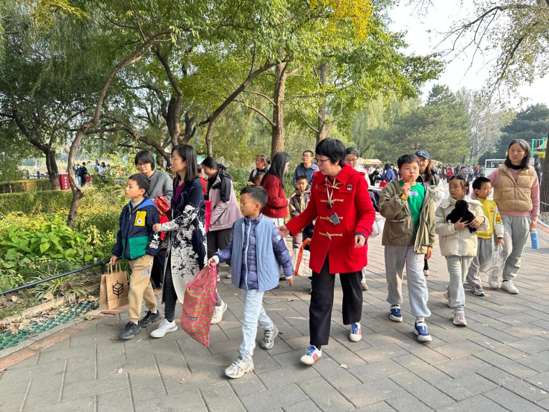 随后,在国家植物园(北园)植物研究所教授级高级工程师陈燕带领下进入实地探索环节。孩子们与家长边走、边看、边学,开启了一场秋日植物 “打卡之旅”。沿着秋日植物观测路线,孩子们近距离观察树叶的形状脉络、果实颜色,并积极提问、捡拾落叶、花朵、松果、种子等“秋日素材”,让课堂上学到的理论知识在自然实景中得到生动印证,在观察与互动中,深化了对秋日植物的认知,真切感受到自然探索的乐趣。