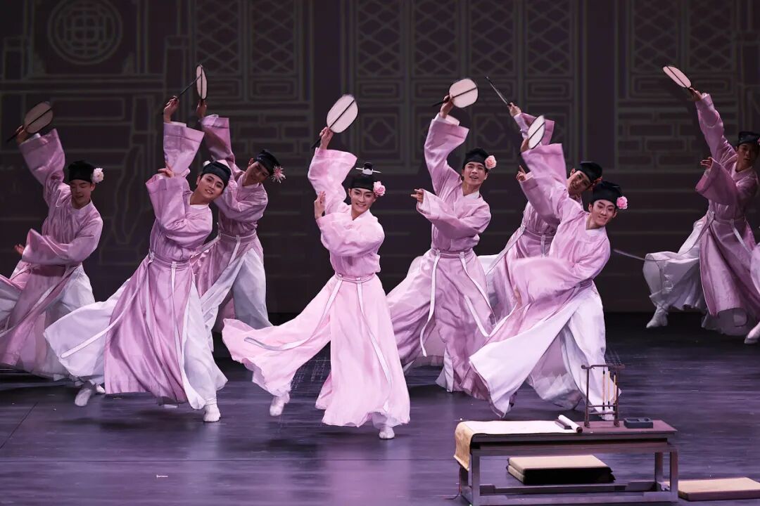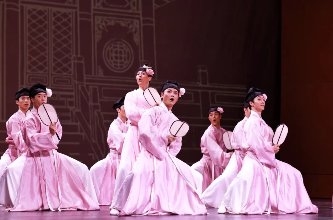 中国东方演艺集团的男子群舞《翰林图画院》选自舞剧《只此青绿》,灵感源于千古名画《千里江山图》,将北宋风雅凝练于方寸舞台。舞者们身形舒卷如山水,举止投足见风骨,把宋代“焚香、点茶、挂画、插花”的雅士情趣,以至简至美的身体诗行徐徐呈现。使凝固的青绿画卷在流动的身韵中焕发新生,传达中式美学的独特魅力。